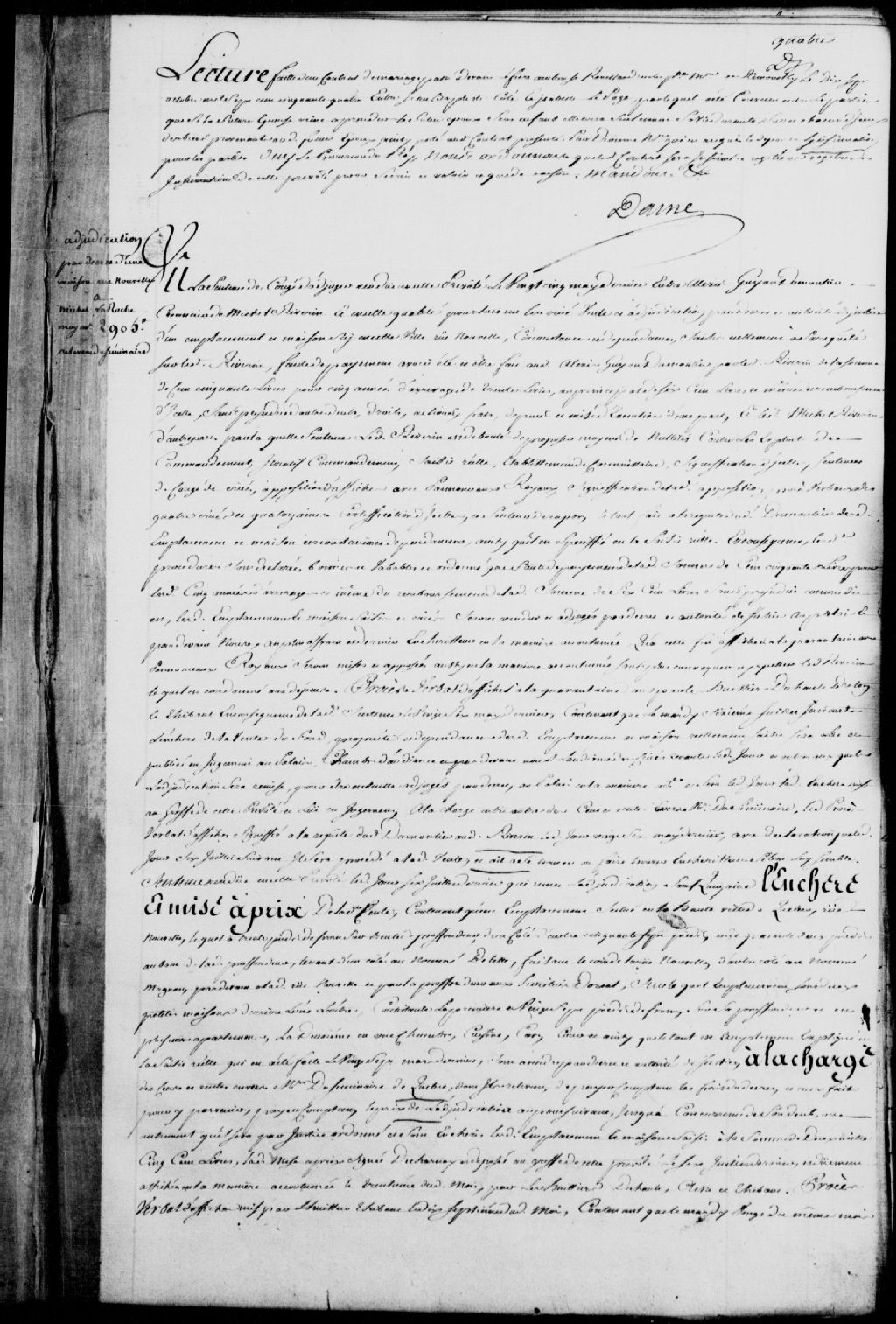 Vente par licitation et adjudication d'une maison et d'un emplacement sis rue Nouvelle, saisis réellement par Alexis Guyon Dumontier, créancier de Michel Riverin, faute de paiement de la somme de 150 livres pour cinq années d'arrérages de rentes par ledit Riverin, ordre de procéder à la dernière criée, lesdits emplacement et maison sont adjugés à Michel Laroche, en tant que plus offrant et dernier enchérisseur, pour la somme de 2905 livres