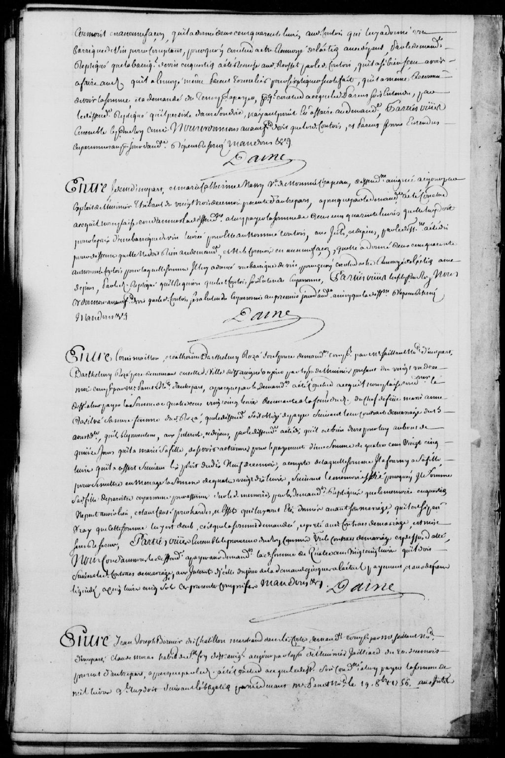 Cause entre Bernard Courejeole (Courjol - Courjolle), négociant, demandeur, comparant par maître Decharnay, notaire; et Marie-Catherine Massy, veuve du nommé Chapeau, défenderesse, ledit demandeur réclame la somme de 240 livres pour le prix d'une barrique de vin livrée pour ladite défenderesse au nommé Contois (Comtois) alors que ladite Massy réplique qu'elle ne doit rien audit demandeur, ayant donné 240 livres audit Contois qui lui a donné une barrique de vin, il est ordonné que le nommé Contois soit entendu, dépens réservés