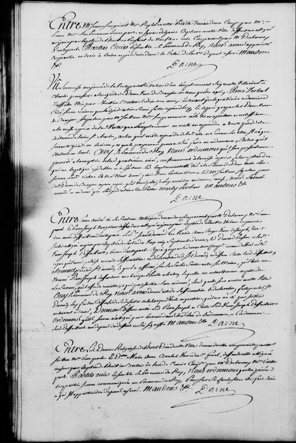 Cause entre Pierre André dit Lafontaine (Fontaine), aubergiste, demandeur, comparant par maître Decharnay (Decharny), notaire; et Pierre Joseph, navigateur, défendeur et défaillant, ainsi que Jean Durand et Marie-Anne Auger, veuve de Joseph, assignés à comparaître, ladite Auger étant défaillante, il est ordonné que ledit Joseph et ladite veuve Joseph, défaillants, soient réassignés à comparaître alors que le défendeur est condamné à payer les dépens dudit défaut