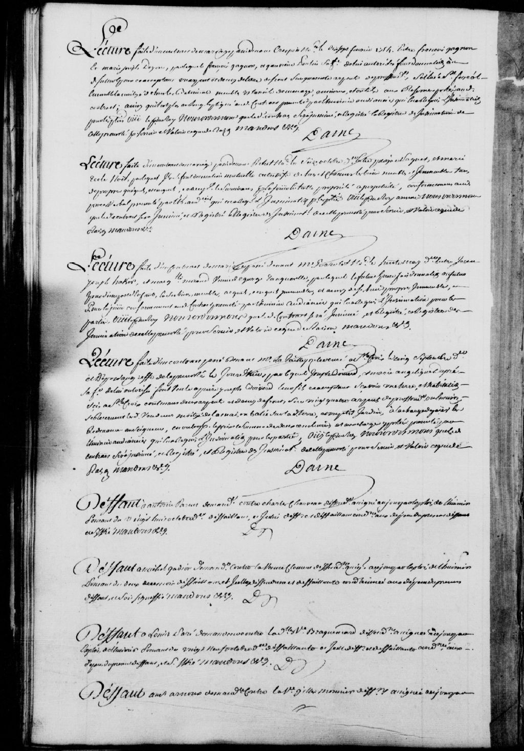 Défaut à Louis Paré, demandeur, contre la veuve Braquemard, défenderesse et défaillante, ladite défaillante est condamnée à payer les dépens
