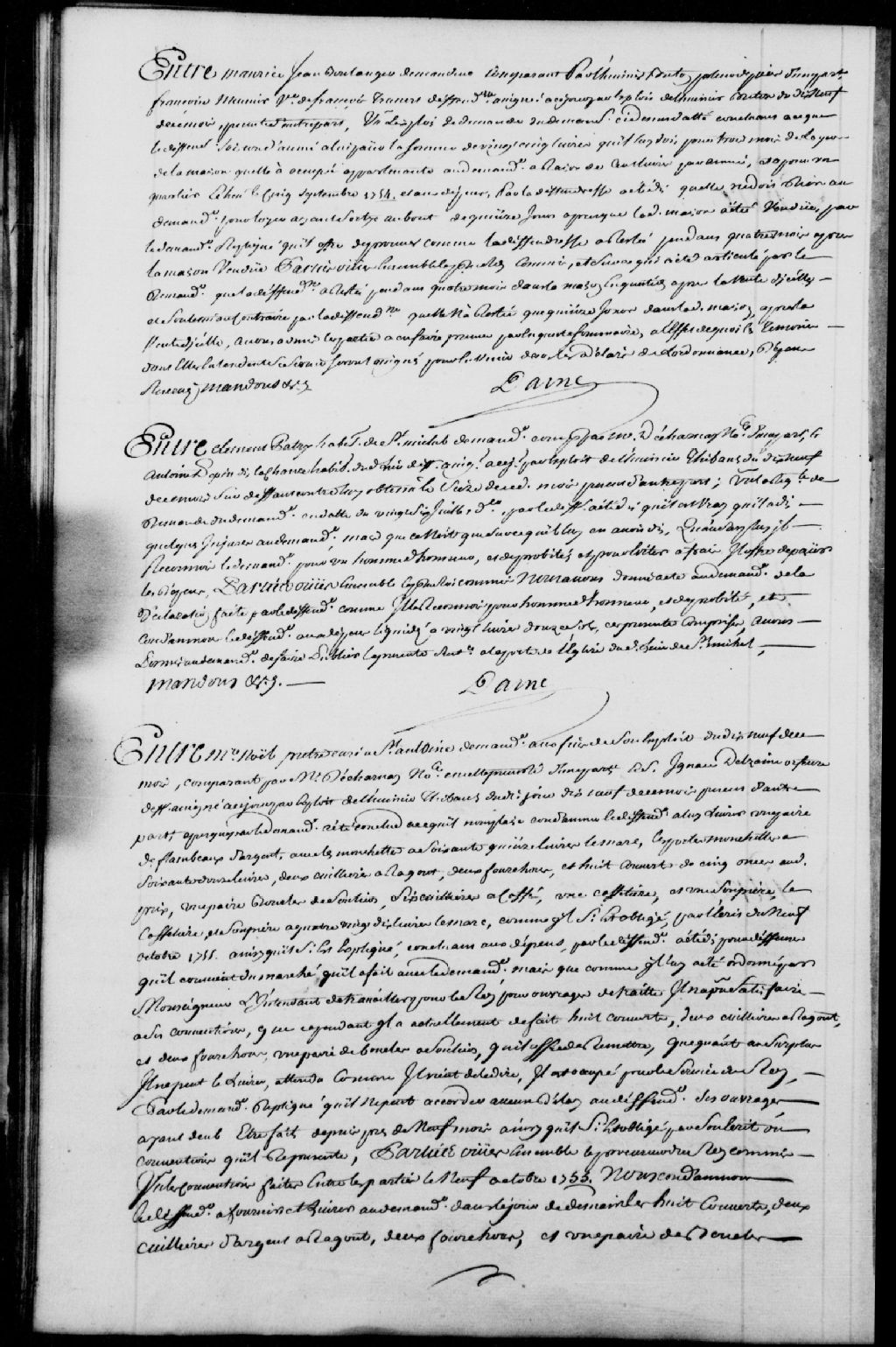 Cause entre messire Noël, prêtre, curé à Saint-Antoine, demandeur, comparant par maître Decharnay (Decharny), notaire; et Ignace Delzaine (Delzenne), orfèvre, défendeur, ledit demandeur réclame que le défendeur lui livre une paire de flambeaux d'argent, avec les manchettes, des porte-manchettes, deux cuillères à ragoût, deux fourchons, une paire de boucles de souliers, six cuillères à café, une cafetière et une soupière, tel que convenu entre les parties le 9 octobre 1755, il est ordonné que ledit Delzaine livre lesdits articles dans la quinzaine en plus d'être condamné à payer les dépens liquidés à 6 livres