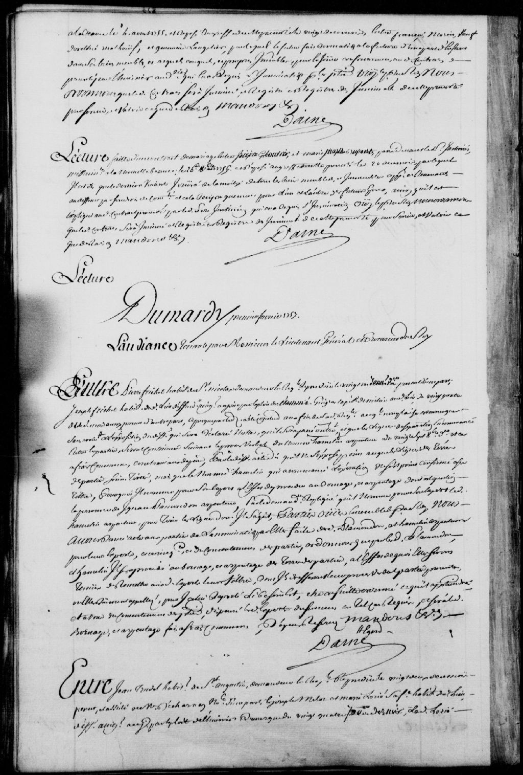 Lecture d'un contrat de mariage passé par-devant le Père Justinien, missionnaire de la Nouvelle-France, le 26 octobre 1756, et déposé au greffe de la Prévôté de Québec le 20 janvier 1757, entre Pierre Cloutier et Marie-Marthe Dupont, il est ordonné que ledit contrat soit insinué au registre des insinuations