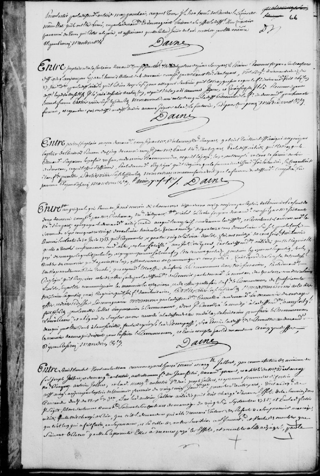 Cause entre Louis Blanchet, tant en son nom que comme ayant épousé Marie-Marguerite Jalbert, que comme tuteur des mineurs de feu Joseph Jalbert et de Marguerite Aubertin, actuellement la femme de Jean Fortin, demandeur, assisté de maître Decharnay (Decharny), notaire; et Antoine Jalbert et ladite Marguerite Aubertin, défendeurs, il est ordonné que ledit demandeur soit tenu de rapporter l'inventaire dont il est question alors qu'il est donné acte d'élection de domicile desdits défendeurs chez Ponsant, huissier, dépens réservés, 8 février 1757, Archives nationales à Québec, Fonds Prévôté de Québec, (03Q,TL1,S11,SS1,D107,P475).