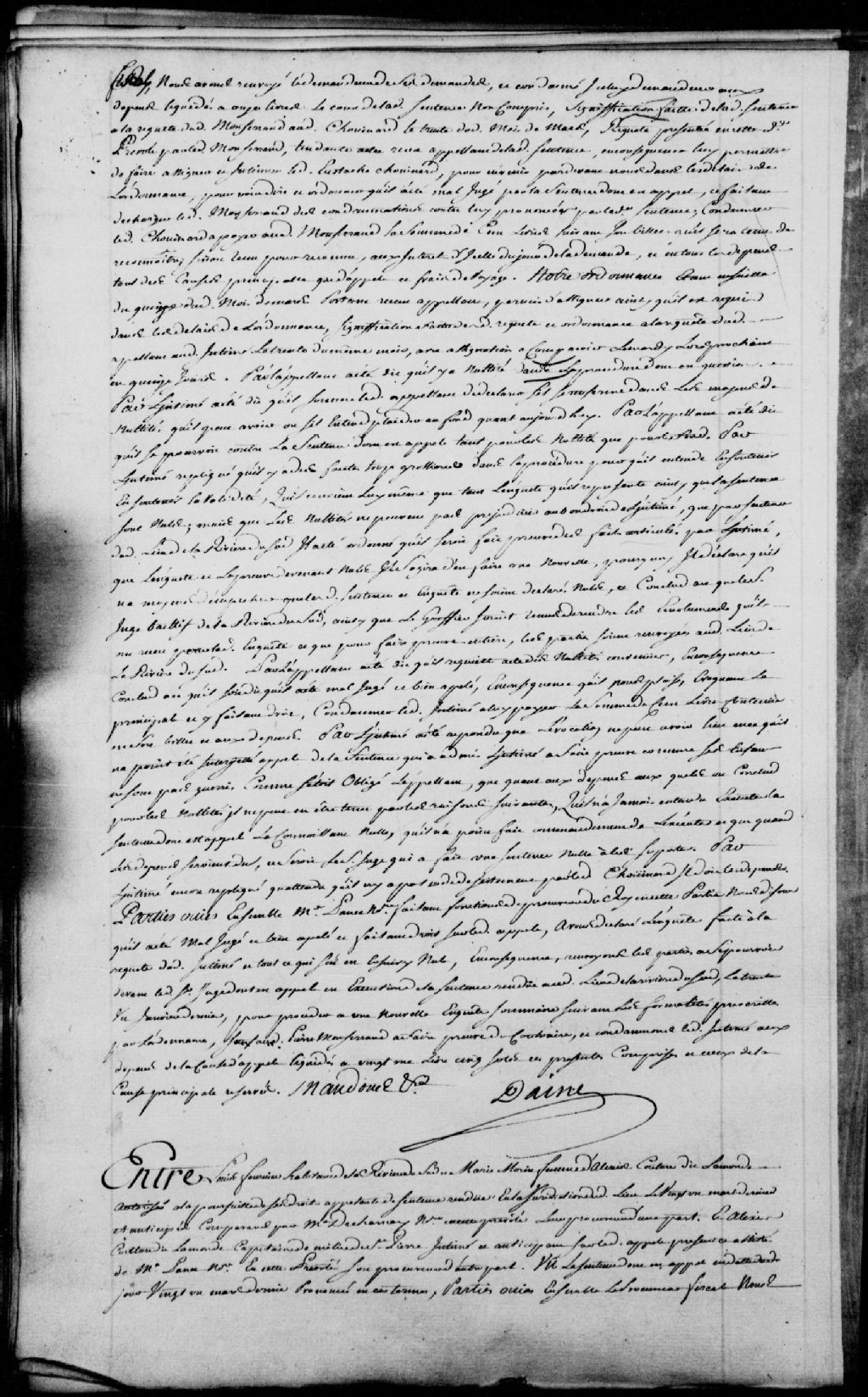 Cause entre Louis Fournier, habitant de la Rivière-du-Sud, et Marie Morin, femme d'Alexis Couture dit Lamonde, autorisée à poursuivre ses droits, appelante de la sentence rendue en la Juridiction de la Rivière-du-Sud le 21 mars 1757, anticipés, ledit Fournier stipulant pour ladite Morin, comparant par maître Decharnay, notaire; et Alexis Couture dit Lamonde, capitaine de milice de Saint-Pierre, intimé et anticipant, assisté de maître Panet, notaire, ledit demandeur déclare qu'il a été mal jugé en plus de poursuivre une demande de séparation alors que ledit défendeur soutient que sa femme a perdu l'esprit, il est déclaré que ledit demandeur a été mal jugé et bien appelé et il est donc ordonné que les parties soient renvoyés se pourvoir par-devant ledit juge dont est appelée la sentence en question, tant pour les raisons de l'interdiction demandée que pour la demande en séparation, alors que ledit intimé est condamné à payer les dépens de la cause principale et de l'appel liquidés à 16 livres et 10 sols
