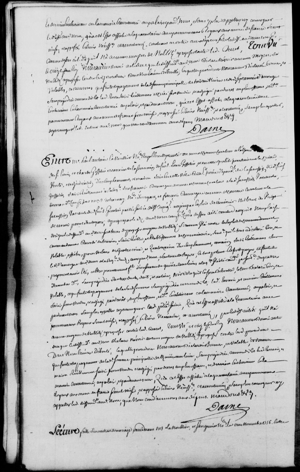 Lecture d'un contrat de mariage passé par-devant maîtres Lanoullier (Lanouiller) et Sanguinet, notaires, le 11 novembre 1756, entre Jacques Dénéchaud et Marie-Angélique Castonguay, il est ordonné que ledit contrat soit insinué au registre des insinuations, 24 mai 1757, Archives nationales à Québec, Fonds Prévôté de Québec, (03Q,TL1,S11,SS1,D107,P848).