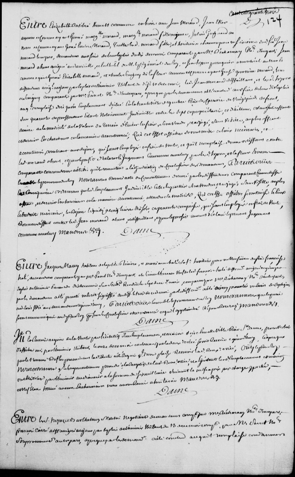 Cause entre Élisabeth Dasilva (Dasylva - Dassylva), veuve et commune en biens avec Jean Morand, Jean Eker (Hecker), au nom et comme ayant épousé Marguerite Morand, Marguerite Morand, fille majeure, Julien Guignard, au nom et comme ayant épousé Louise Morand, toutes lesdites Morand filles et héritières pour chacune un sixième dudit feu Jean Morand, leur père, demandeurs, comparant par maître Decharnay, notaire, d'une part; et Jean Morand, Jean Hyvon (Yvon), perruquier à Montréal, au nom et comme ayant épousé Élisabeth Morand, Charles Sévigny dit Lafleur, au nom et comme ayant épousé Geneviève Morand, défendeurs, ledit Morand défaillant et lesdits Hyvon et Sévigny comparant par maître Panet, notaire, à propos d'un emplacement sis rue des Carrières qui est indivisible entre les parties, il est ordonné que ledit emplacement soit vendu par licitation et adjugé au plus offrant et dernier enchérisseur