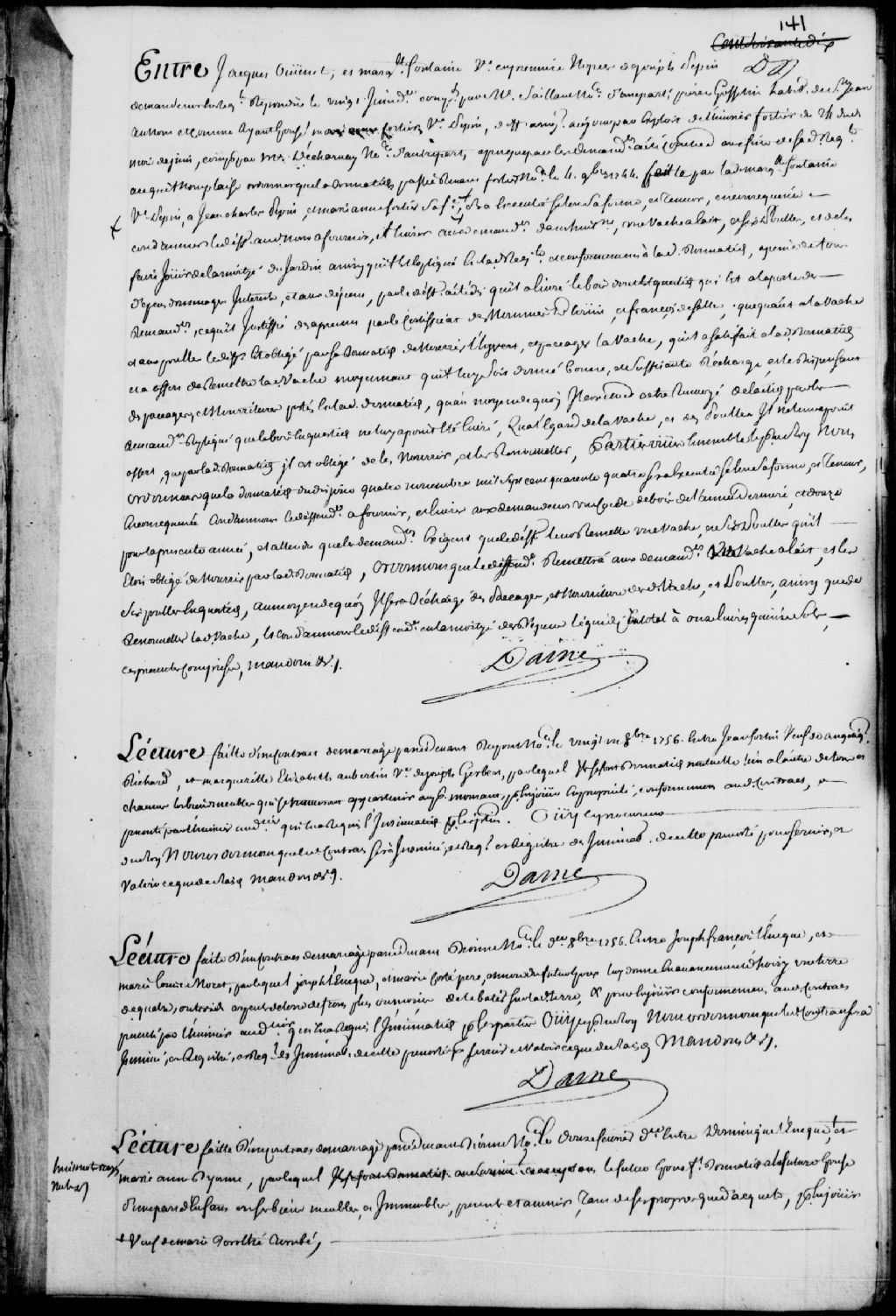 Lecture d'un contrat de mariage passé par-devant Dionne, notaire, le 31 octobre 1756, entre Joseph-François L'Éveque (Lévesque) et Marie-Louise Moret (Morai), par lequel Joseph L'Eveque et Marie Costé (Côté), père et mère du futur époux, lui font don en avancement d'hoirie d'une terre de quatre arpents de front, il est ordonné que ledit contrat soit insinué au registre des insinuations