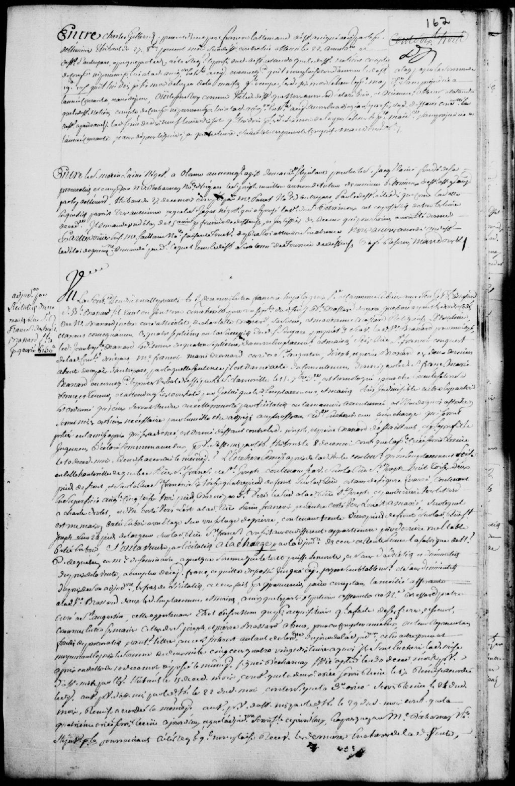 Vente d'un emplacement et maison sis rue Saint-François, suite à la sentence rendue le 3 octobre 1758, entre Françoise Hupé (Huppé) dit Lagroix, veuve et commune en biens de feu Jean-Baptiste Brassard, Jean-Baptiste Brassard fils, héritier de son défunt père et comme ayant les droits cédés de maître Brassard, prêtre curé à Nicolet, Charlotte Brassard, sa soeur, et Marie-Anne Brassard, religieuse Ursuline, lesdits héritiers Brassard chacun propriétaire de parts en un emplacement et maison sis rue Saint-François, et maître François-Marie Brassard, curé de Saint-Augustin, et Joseph Brassard et Pierre Brassard, absents de la Nouvelle-France ; description dudit emplacement et maison et noms des voisins ; réception des dernières enchères, mises et noms des enchérisseurs ; ledit emplacement est adjugé à Pierre Gauvin pour la somme de 6150 livres