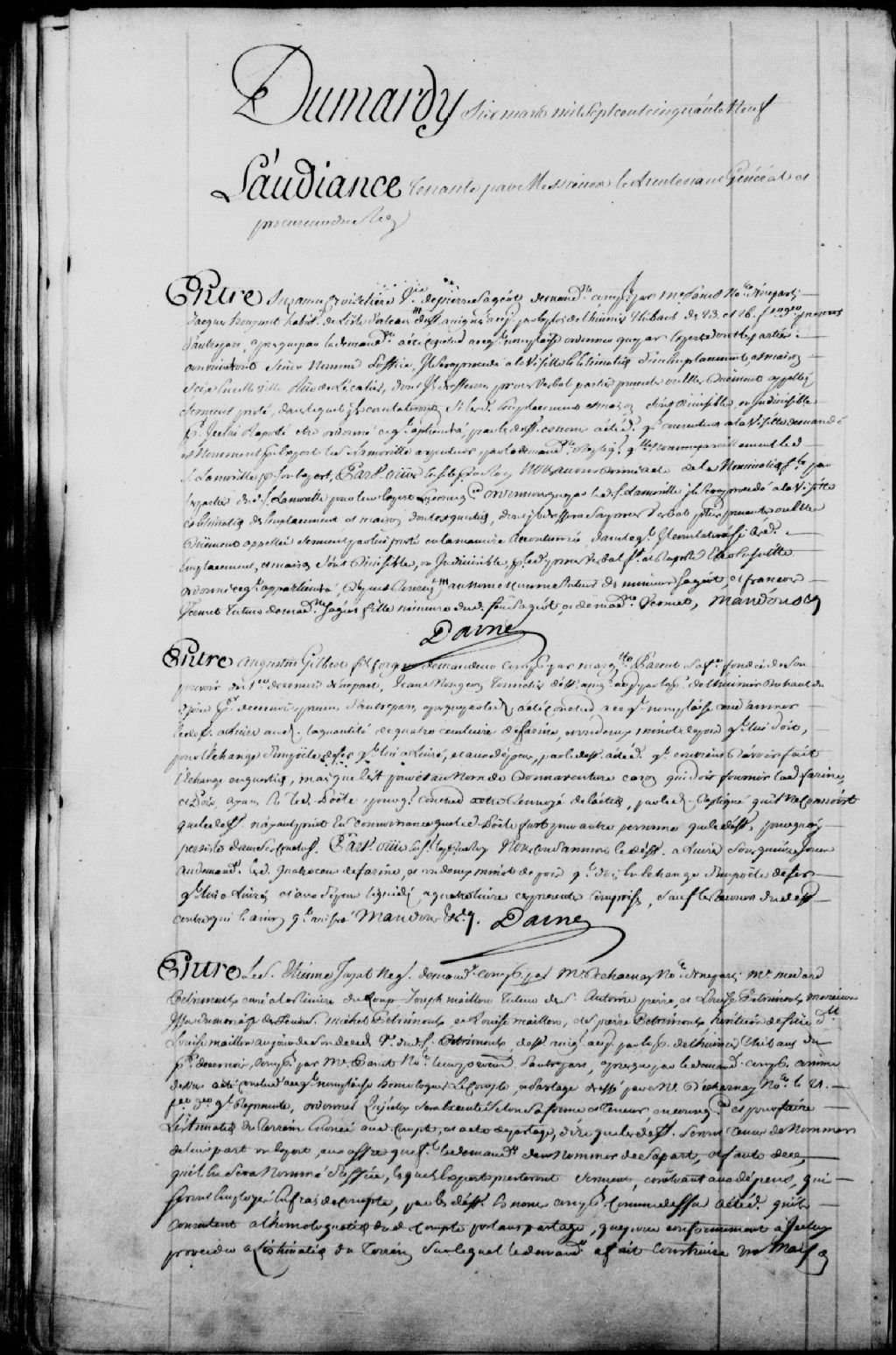 Cause entre Augustin Gilbert, fils, forgeron, demandeur, comparant par Marguerite Parent, son épouse, fondée de son pouvoir en date du 1er mars 1758, et Jean Mongeon, tonnelier, défendeur, lequel est condamné à livrer au demandeur les quatre cents de farine dont il est question et un demi minot de pois qu'il doit en échange d'un poêle de fer, ledit défendeur est également condamné aux dépens liquidés à 4 livres