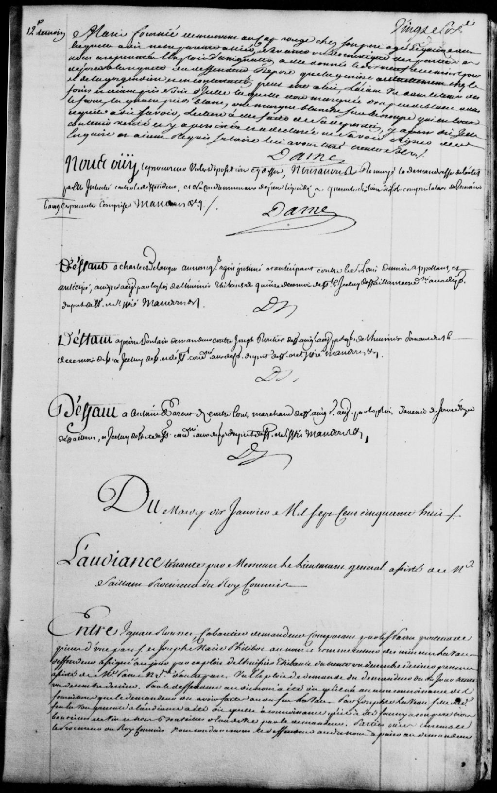 Cause entre Ignace Roussel, cabaretier, demandeur, comparant par le sieur Parrer (Paré), porteur de pièces, Joseph-Marie Philibot (Flibot), au nom et comme tuteur des mineurs de feu Charles Lavau, défendeur, assisté de maître Panet, notaire, à propos du paiement de bouteilles de vin et d'eau-de-vie (alcool) ; le demandeur est renvoyé du surplus de ses conclusions, et le défendeur est condamné aux dépens liquidés à 4 livres et 10 sols