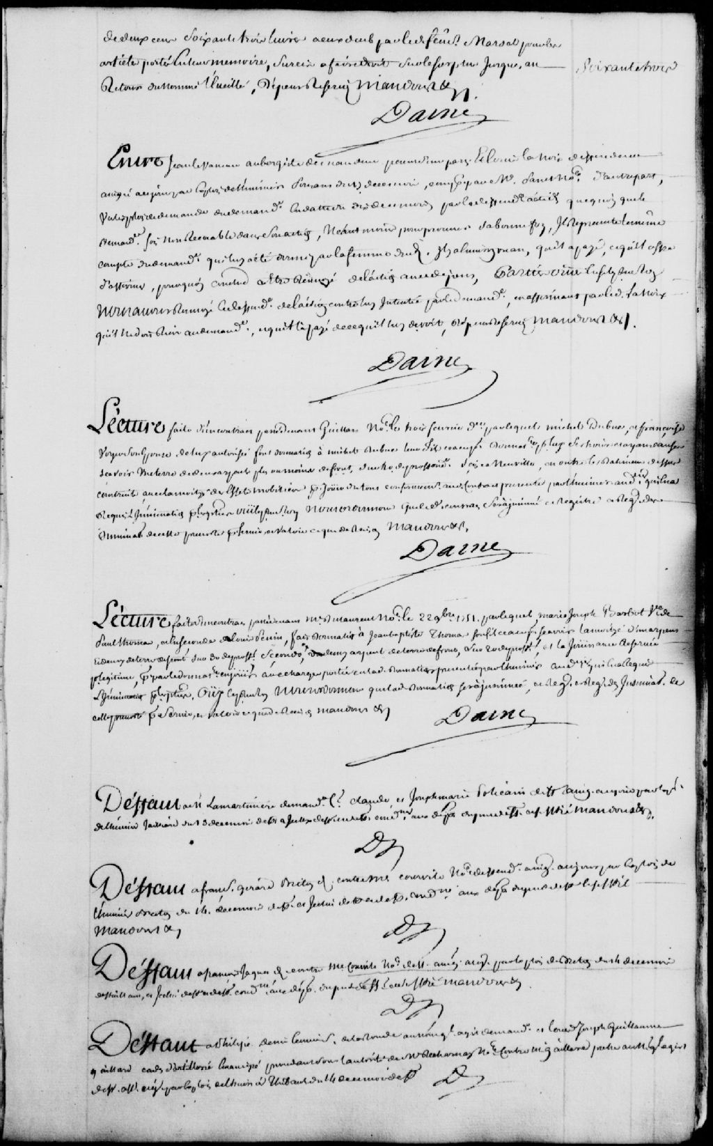 Lecture d'un contrat passé devant maître Guillart, notaire, le 3 février 1758, par lequel Michel Dubuc et Françoise Voyer, son épouse de lui autorisée, font donation à Michel Dubuc, leur fils, d'une terre et d'un bâtiment sis à Neuville ; suit l'ordre d'enregistrer ledit contrat au registre des insinuations, 21 mars 1758, Archives nationales à Québec, Fonds Prévôté de Québec, (03Q,TL1,S11,SS1,D108,P421).