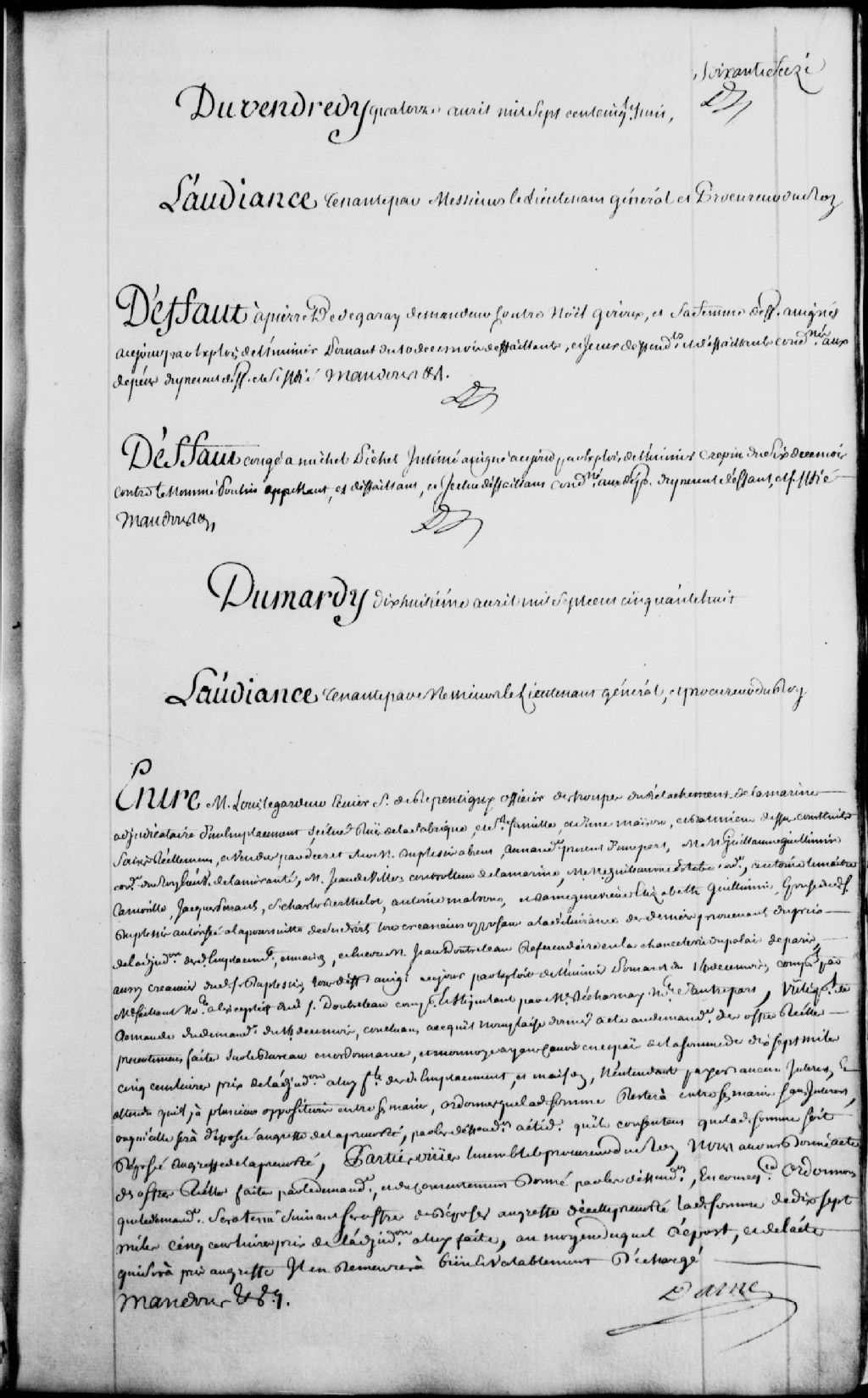 Cause entre maître Louis Legardeur, écuyer, sieur de Repentigny, officier des troupes du détachement de la Marine, demandeur, adjudicataire d'un emplacement, avec maison et bâtiments, sis sur les rues de la Fabrique et Sainte-Famille, lequel emplacement saisi sur le nommé Duplessis, absent, et maître Guillaume Guillemin, conseiller du roi, lieutenant de l'Amirauté, maître Jean de Villier (Devillier), contrôleur de la Marine, maître Guillaume Estebe, Antoine Lemaître Lamorille, Jacques Perraut (Perrault), le sieur Charles Berthelot, Antoine Malroux (Malro), et dame Geneviève-Élizabeth Guillemin, épouse du sieur Duplessis, autorisée à la poursuite de ses droits, tous créanciers, et encore Jean Doutreleau, référendaire en la chancellerie du Palais de Paris, aussi créancier dudit Duplessis, les premiers créanciers comparant par maître Saillant, notaire, et ledit Doutreleau comparant par maître Decharnay, notaire ; il est ordonné que ledit demandeur sera tenu de déposer au greffe la somme de17 500 livres, prix de l'adjudication à lui faite