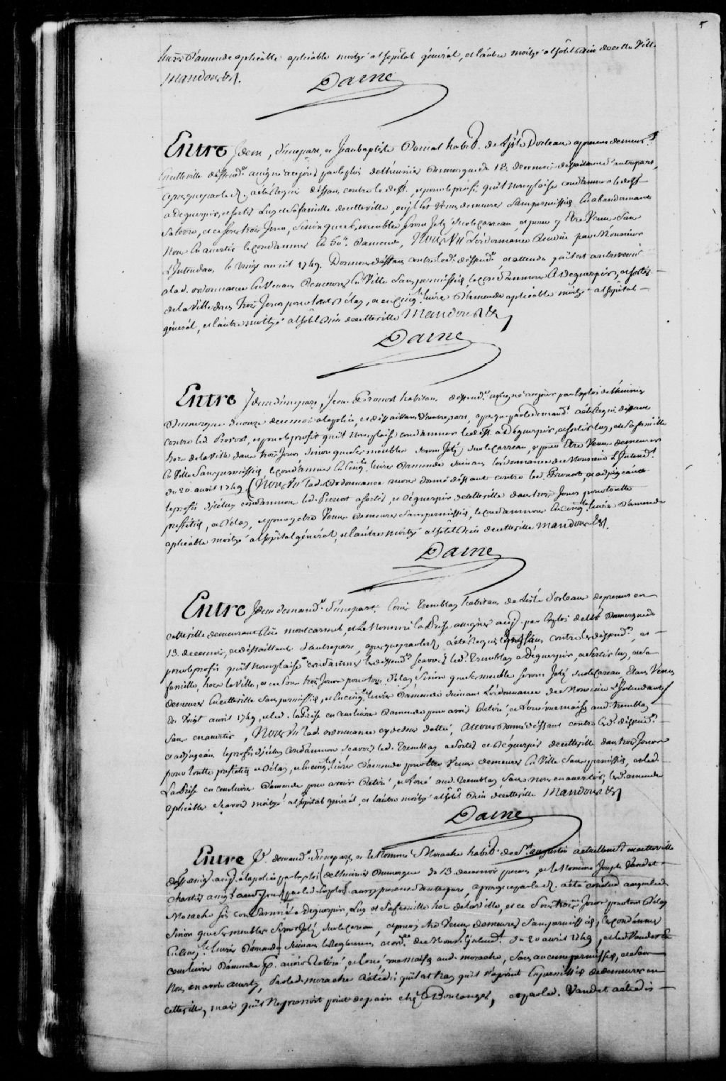Cause entre le procureur du roi au siège de la Prévôté de Québec, demandeur, et Louis Tremblay, habitant de l'île d'Orléans, demeurant rue du Mont-Carmel à Québec, et le nommé Laprise, aussi assigné, défendeurs et défaillants ; mention de l'ordonnance du 20 avril 1749 ; ledit Tremblay est condamné à sortir et déguerpir de la ville dans trois jours pour y être venu sans permission, il est condamné à 50 livres d'amende applicable pour moitié à l'Hôpital général et à l'Hôtel-Dieu de Québec, ledit Laprise est condamné à 100 livres d'amende pour avoir loué audit Tremblay sans en avertir, payable aussi pour moitié auxdits hôpitaux, 17 mai 1758, Archives nationales à Québec, Fonds Prévôté de Québec, (03Q,TL1,S11,SS1,D108,P650).