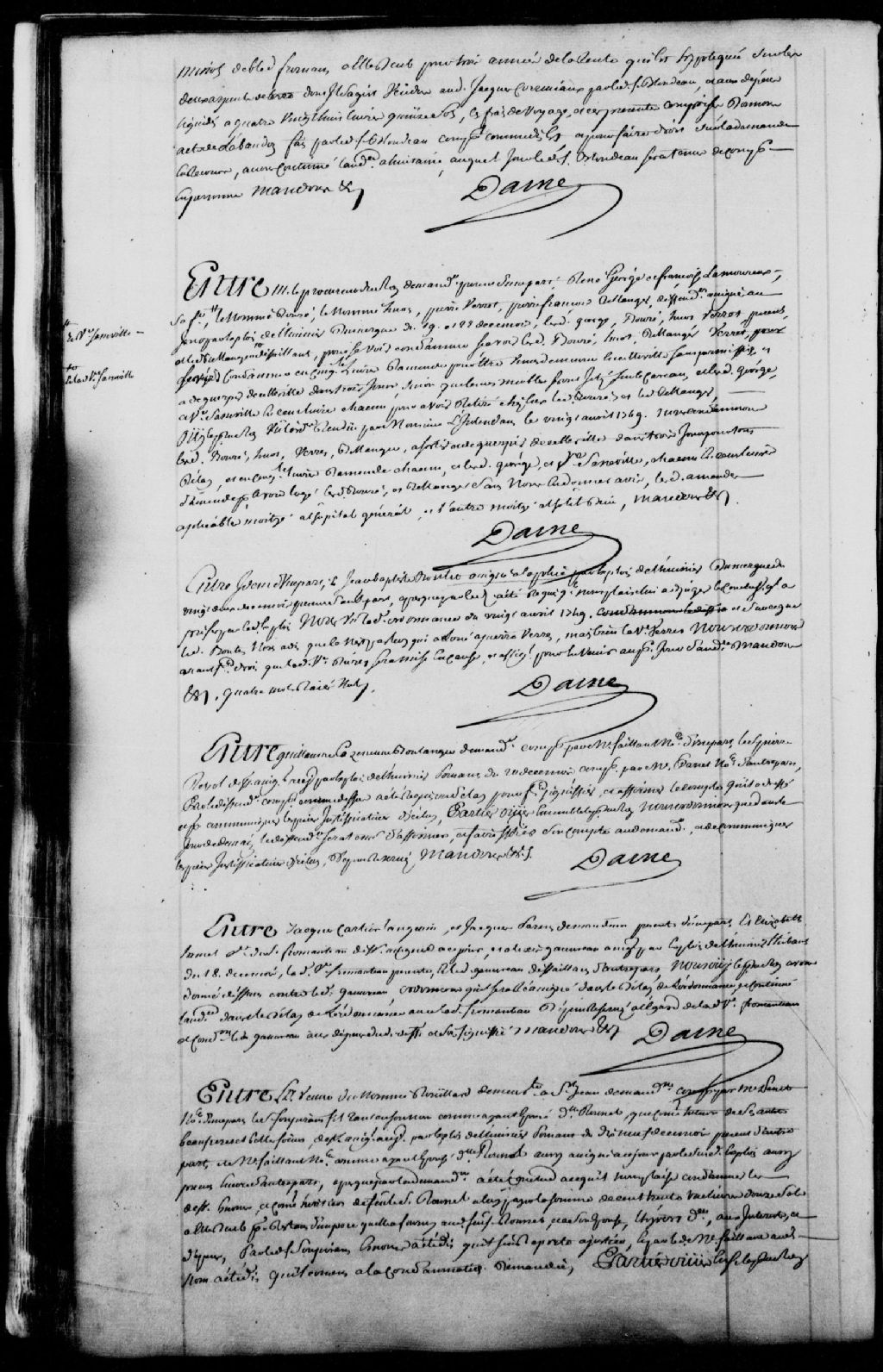 Cause entre le procureur du roi au siège de la Prévôté de Québec, demandeur, et René Georges et Françoise Lamoureux, son épouse, veuve Sasseville, le nommé Bouré (Bouret), le nommé Huot, Pierre Verret et Pierre-François Bellanger (Bélanger), tous défendeurs ; mention de l'ordonnance du 20 avril 1749 ; lesdits Bouré (Bouret), Huot, Verret et Bellanger (Bélanger) sont condamnés à sortir et déguerpir de Québec dans trois jours et à 50 livres d'amende chacun, lesdits Georges et Sasseville sont condamnés chacun à 100 livres d'amende pour avoir logé lesdits Bouré (Bouret) et Bélanger (Bélanger) sans en donner avis, lesdites amendes sont applicables pour moitié à l'Hôpital général et à l'Hôtel-Dieu de Québec