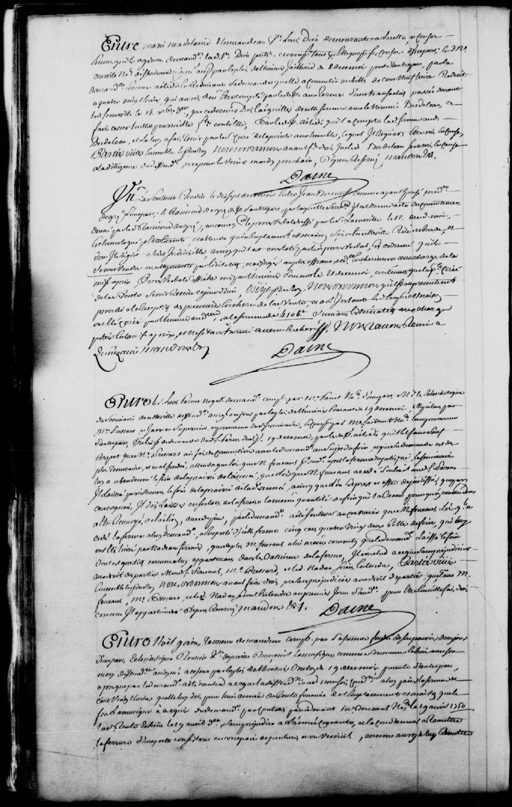 Cause entre Noël Giroux, tanneur, demandeur, comparant par son épouse, fondée de son pouvoir, et Scholastique Roussin, veuve de feu Pierre Dumesnil Lamusique, commune en biens avec ledit défunt, défenderesse ; mention d'un contrat d'acquisition passé devant maître Boucault, notaire, le 19 avril 1750 ; ladite défenderesse est condamnée à payer au demandeur la somme de 120 livres pour huit années de rentes foncières, ladite défenderesse est également condamnée aux dépens liquidés à 3 livres et 15 sols