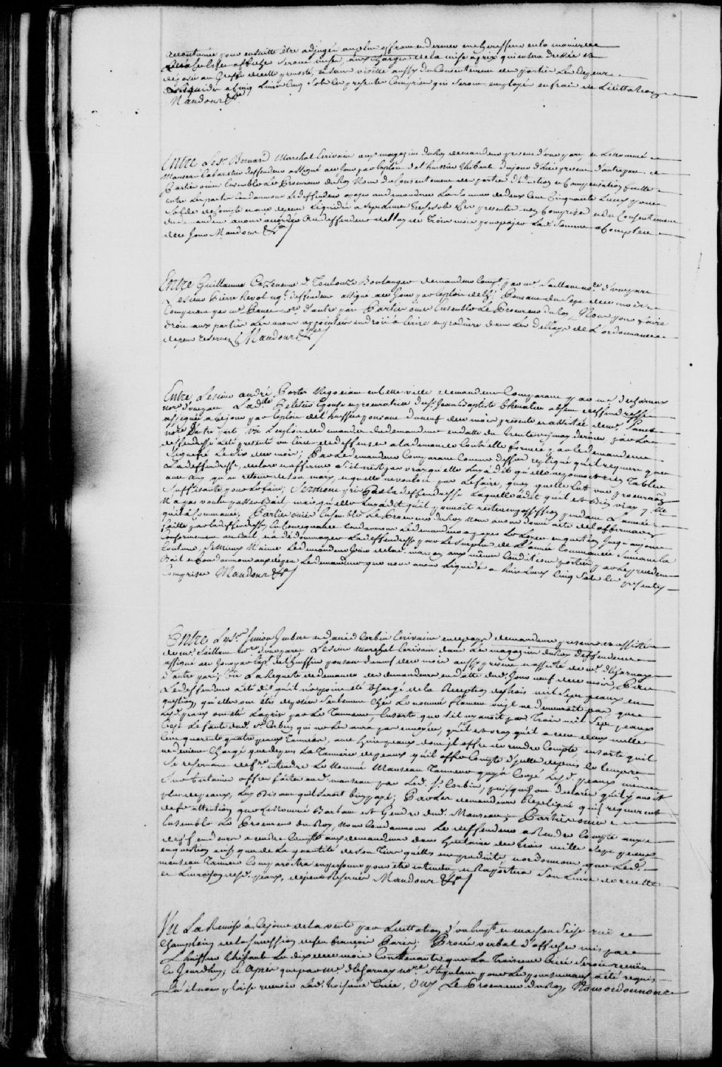 Cause entre le sieur Simon Imbert et David Corbin, écrivain en Nouvelle-France, demandeurs, assistés de maître Saillant, notaire, et le sieur Marchal, écrivain dans les magasins du roi, défendeur, assisté de maître Decharnay, notaire ; mention du nommé Maureau (Moreau - Marceau), tanneur, et du nommé Barbau (Barbeau), gendre dudit Maureau (Moreau - Marceau) ; le défendeur est condamné à rendre compte aux demandeurs des 3007 peaux dont il est question et de la qualité du cuir qu'elles ont produit, ledit Maureau (Moreau - Marceau) devra comparaître en personne en rapportant son livre des recettes et livraisons desdites peaux