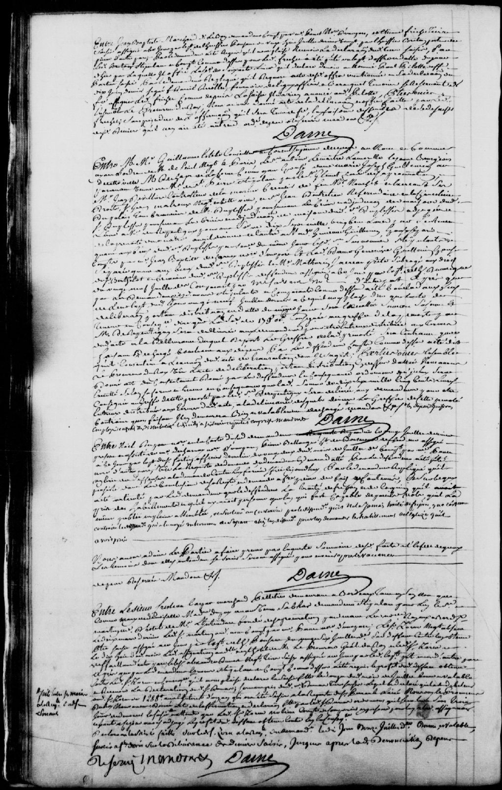 Cause entre le sieur Christian Caspar (Caspard), marchand pelletier demeurant à Bordeaux, époux de Madeleine Dupuy (Dupuis), demandeur, stipulant par le sieur Martin, maître d'hôtel de monsieur l'Intendant, fondé de sa procuration passée devant des notaires royaux à Bordeaux, en date du 2 mars 1758, comparant par maître Panet, notaire, et le sieur Zorn (Zorne), négociant, absent, défendeur et encore défaillant, et encore le sieur Alexandre Dumas, négociant, tiers saisis, laquelle saisie faite sur ledit Zorn à la requête du sieur Perrault l'aîné en date du 12 juillet 1758 ; la saisie en question est déclarée bonne et valable