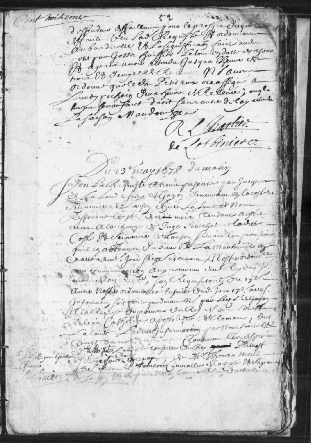 Requête présentée par Jacques de Lalande, sieur de Gayon (Gaillon), demeurant en la côte et seigneurie de Lauzon, afin d'accéder à la charge de juge sénéchal dudit lieu ; il est ordonné que les informations de vie et moeurs sur ledit requérant seront faites ; lesquelles informations sont faites en date du 21 mai 1678, et contiennent les dépositions de maître de Comporté, conseiller du Roi, prévôt de la maréchaussée en Nouvelle-France, de maître Thomas Morel, faisant les fonctions curiales en la côte et seigneurie de Lauzon, et de Pierre Nolan, bourgeois de Québec ; il est ensuite ordonné que la provision dont il est question sera enregistrée au greffe, avec une prestation de serment sur les évangiles par ledit requérant