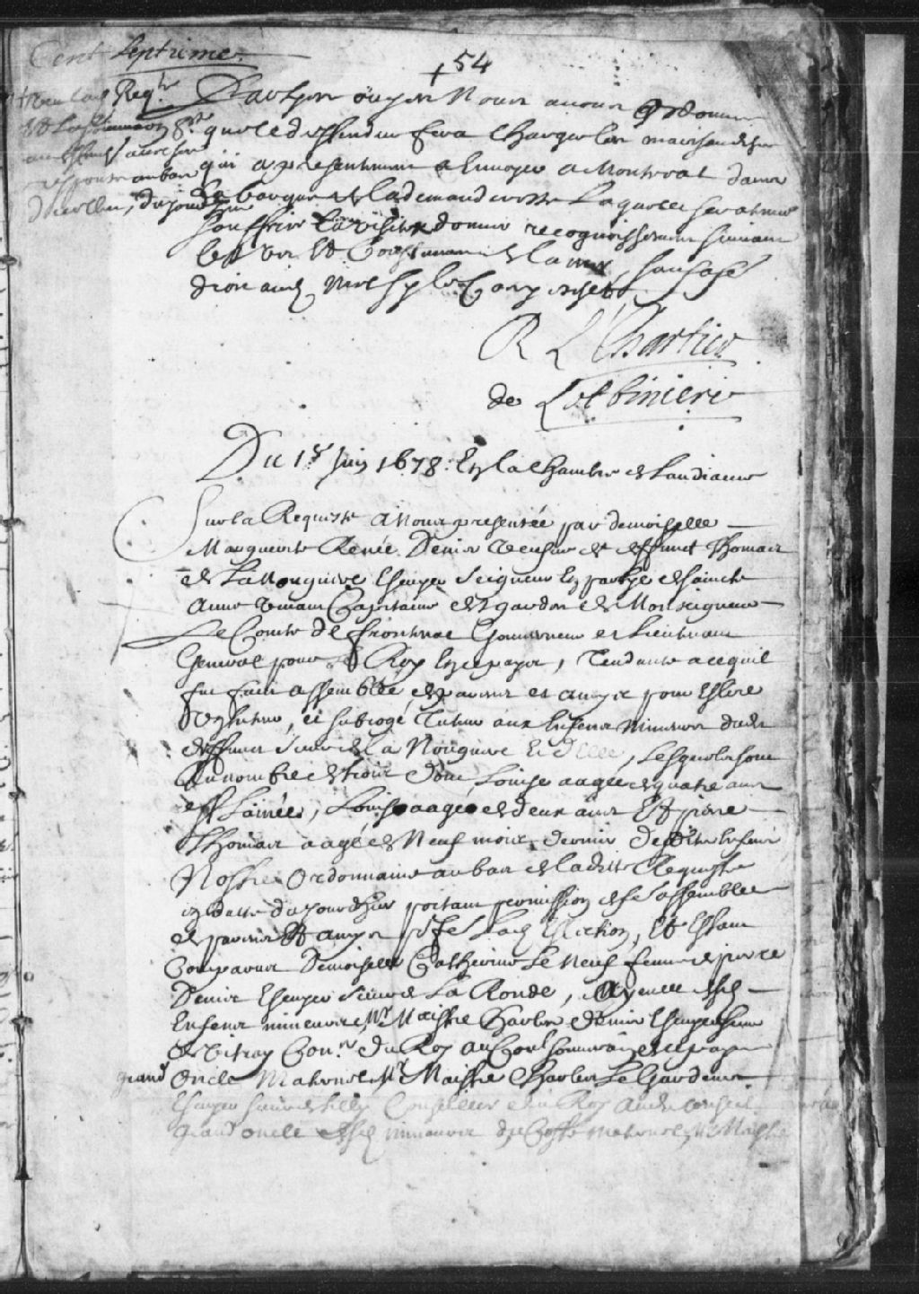 Requête présentée par Marguerite-Renée Denis, veuve du feu Thomas de la Nouguère (Tarieu de LaNouguère), de son vivant écuyer, seigneur en partie de Sainte-Anne et capitaine des gardes de monsieur le comte de Frontenac, gouverneur et lieutenant général pour le Roi en ce pays, afin de faire élire un tuteur et un subrogé tuteur aux enfants mineurs dudit défunt, soit Louise, âgée de 4 ans, Louis, âgé de 2 ans, et Pierre Thomas, âgé de 9 mois ; mention de l'assemblée de parents et amis dans le cadre de laquelle ladite demoiselle Marguerite-Renée Denis, veuve dudit défunt, est élue tutrice desdits enfants, mais étant elle-même mineure, la demoiselle Catherine Leneuf prendra soin de la tutelle jusqu'à sa majorité ; mention de l'assemblée de parents et amis où sont présents demoiselle Catherine Leneuf, épouse de Pierre Denis, écuyer, sieur de LaRonde (Ronde - Delaronde), aïeule des mineurs concernés, maître Charles Denis, écuyer, sieur de Vitray (Vitré - Levitré), conseiller du Roi au Conseil souverain en Nouvelle-France, grand oncle maternel, maître Charles Legardeur, écuyé, sieur de Tilly, conseiller du Roi audit Conseil, grand oncle maternel, maître Nicolas Dupont, écuyer, sieur de Neuville, conseiller du Roi audit Conseil, maître Laurent Bolduc, conseiller et procureur du Roi en la Juridiction de Québec, Olivier Morel, écuyer, sieur de la Durantaye, capitaine au régiment Montaigu, et François Provost, écuyer, major de Québec