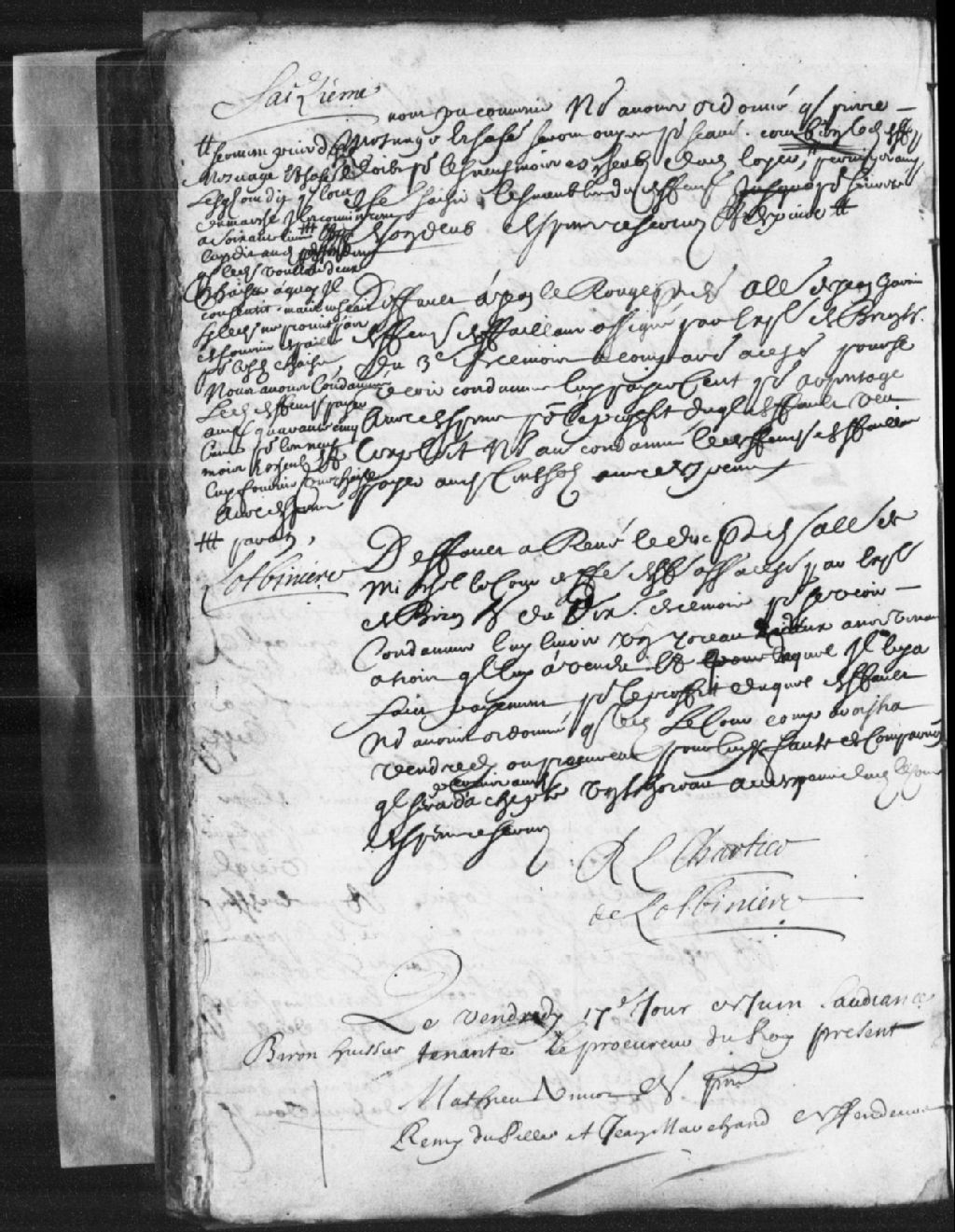Cause entre Mathieu Amiot, demandeur, et Rémi Dupil et Jean Marchand, défendeurs ; vu la promesse dont il est question, il est ordonné que le défendeur fera sa poursuite à l'encontre du nommé Lecours, 17 juin 1678, Archives nationales à Québec, Fonds Prévôté de Québec, (03Q,TL1,S11,SS1,D12,P248).