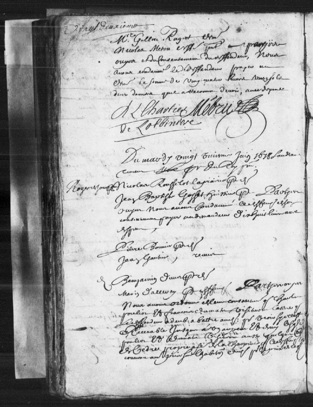Cause entre Benjamin Duvet, demandeur, et Marin Dalleray, défendeur ; il est ordonné que Charles Pouliot et François Dumas (Dumais) feront une visite (il est question de cèdre et de charpente), 21 juin 1678, Archives nationales à Québec, Fonds Prévôté de Québec, (03Q,TL1,S11,SS1,D12,P269).