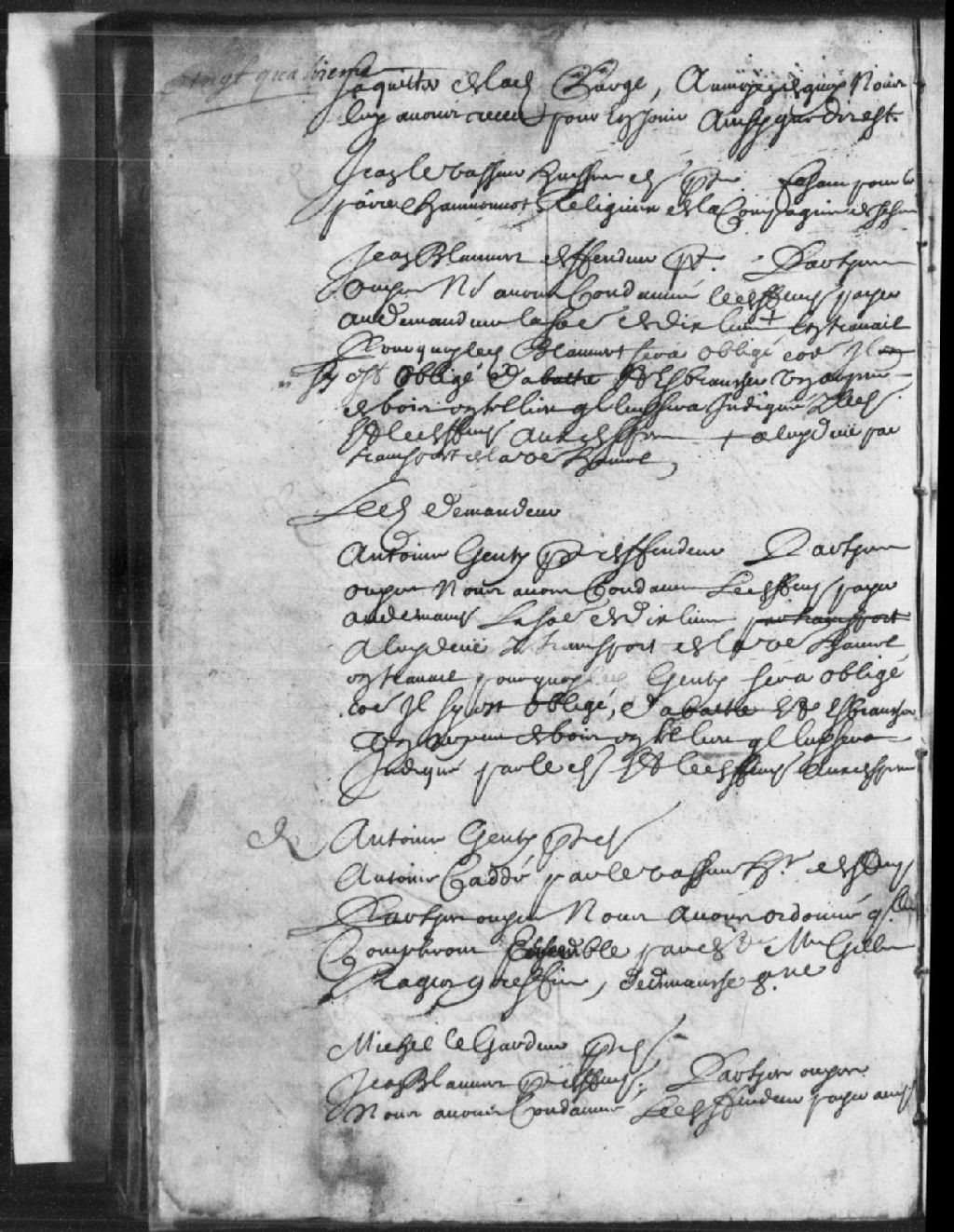 Cause entre Jean Levasseur, huissier, faisant pour le Père Chaumont, Religieux de la Compagnie des Jésuites, demandeur ; et Jean Blanchet, défendeur, lequel est condamné à abattre un arpent de bois, 4 février 1678, Archives nationales à Québec, Fonds Prévôté de Québec, (03Q,TL1,S11,SS1,D12,P29).