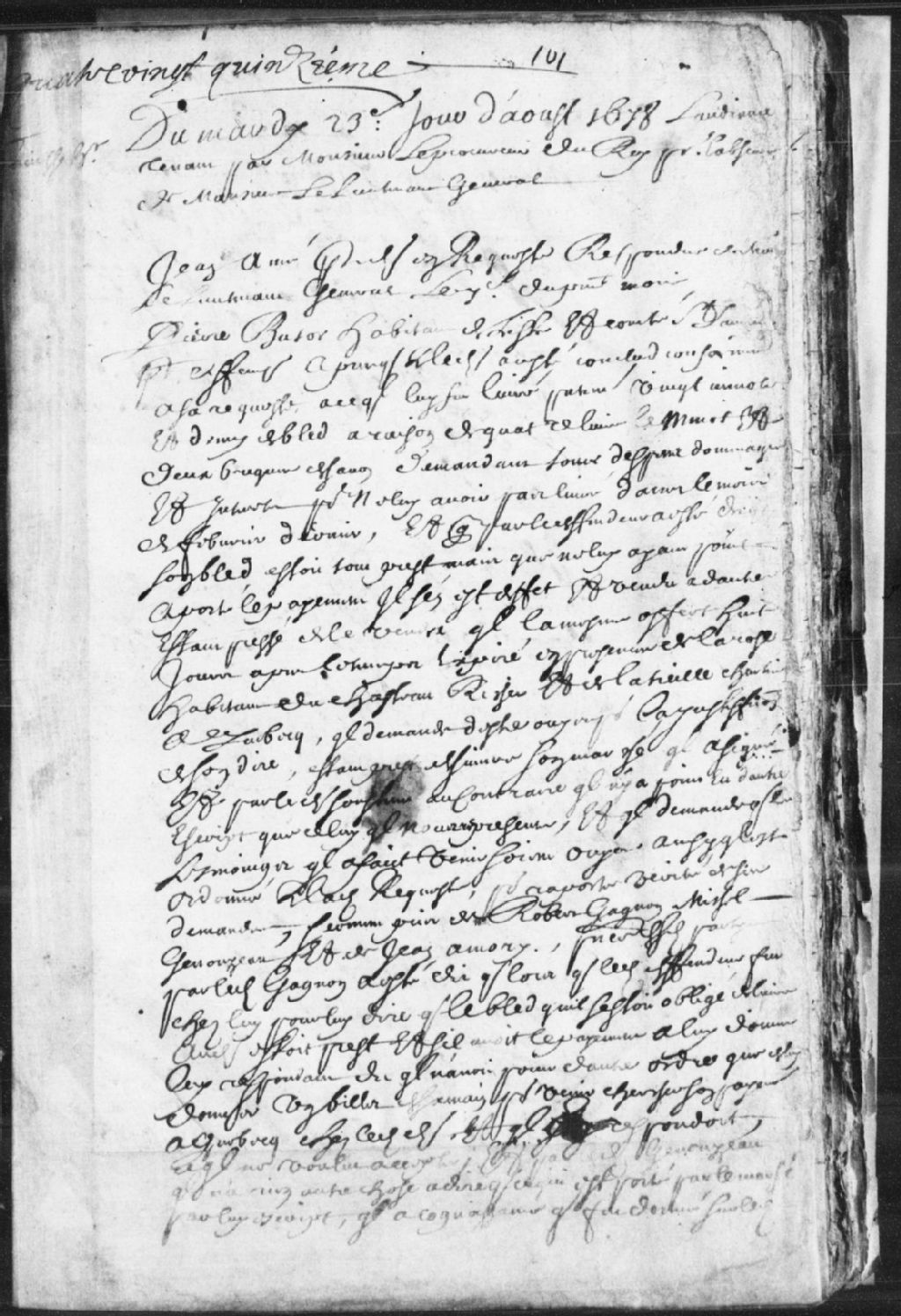 Cause entre Jean Amiot, demandeur, et Pierre Buteau, habitant de l'île et comté de Saint-Laurent (île d'Orléans), défendeur, à propos de minots de blé ; il est fait mention d'un nommé Larose, habitant de Château-Richer, d'un nommé Latreille, charretier de Québec, de Robert Gagnon, Michel Genouzeau (Genouseau), Jean Amory, et d'une brique de savon, et il est ordonné que les nommés Latreille et Larose seront entendus