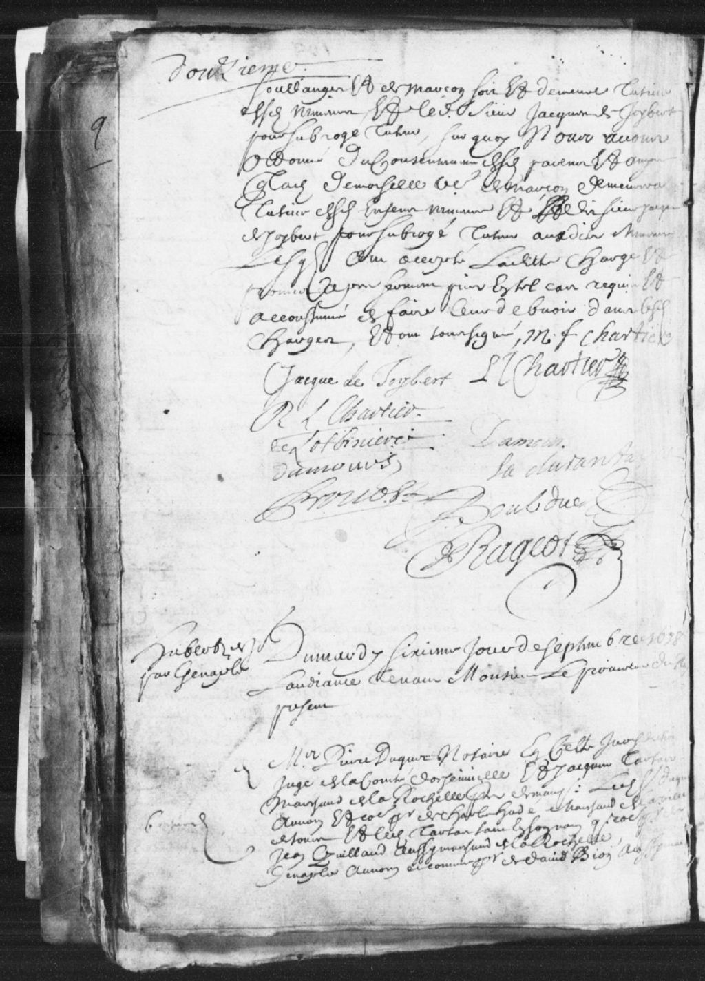 Cause entre maître Pierre Duquet, notaire de la Juridiction de Québec, juge de la côte d'Orsainville, faisant au nom et pour Charles Hudé, marchand de la ville de Tours, Jacques Tartas, marchand de La Rochelle, faisant tant en son nom que pour Jean Guilland (Garraud), aussi marchand de La Rochelle, François Genaple, faisant au nom et pour David Bion, aussi marchand de La Rochelle, et pour Moïse Petit, marchand, et ledit Duquet faisant encore pour maître Romain Becquet, notaire de Québec et juge de la côte de Beaupré, demandeurs ; et Guillaume Boutin, marchand de La Rochelle, défendeur ; il est fait mention des effets appartenant à la succession de feu Jacques Girard, marchand de la ville de Mayenne, et il est ordonné que ledit Boutin rendra compte incessamment des effets et que Gosset rendra les papiers de ladite succession au défendeur dans vingt-quatre heures, sous peine d'être contraint par corps (force), 6 septembre 1678, Archives nationales à Québec, Fonds Prévôté de Québec, (03Q,TL1,S11,SS1,D12,P433).