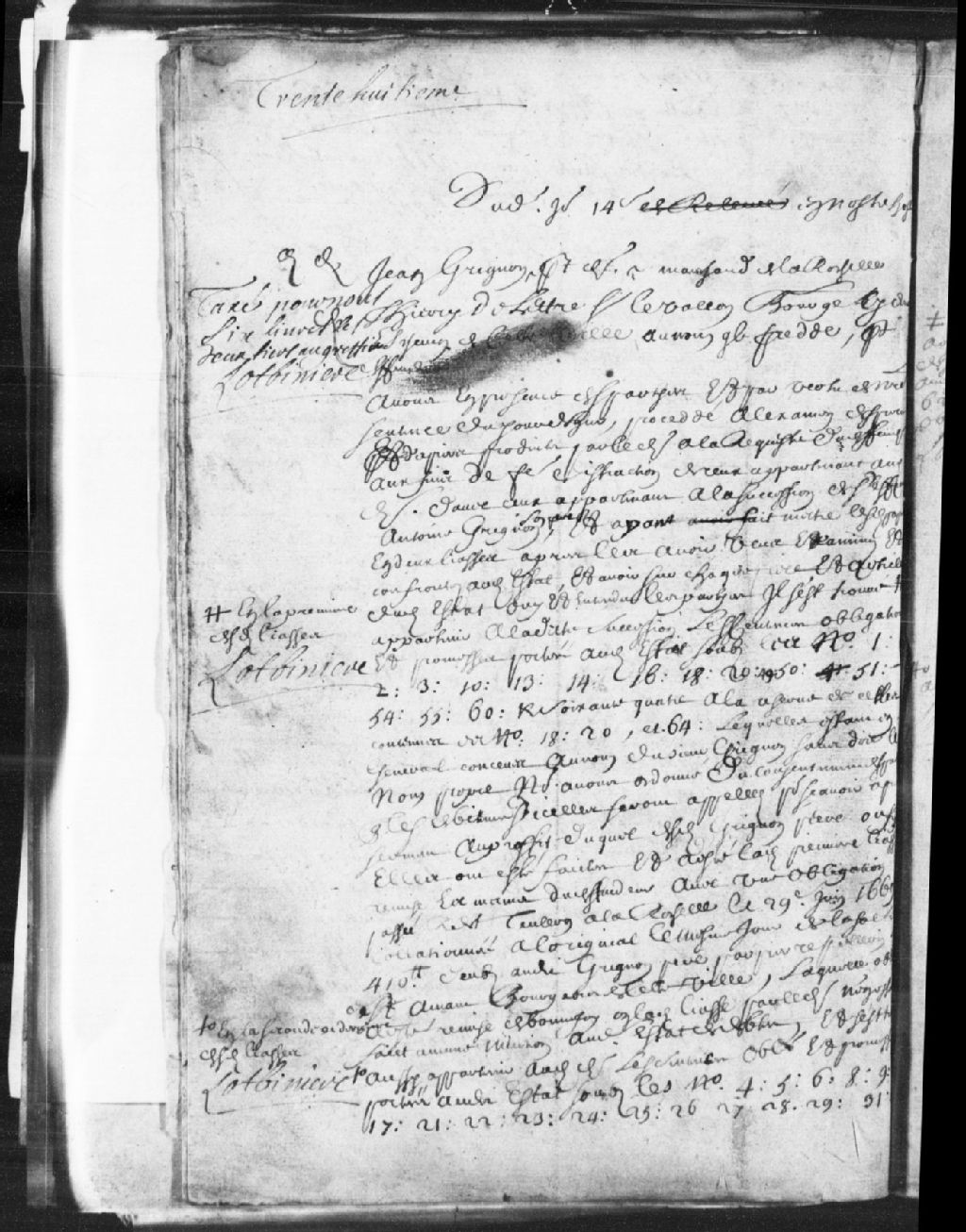 Cause entre Jean Grignon, marchand de la ville de La Rochelle, demandeur, et Thierry Delestre dit Le Vallon (DuValon), bourgeois de Québec, défendeur, à propos d'une procuration que le défendeur dit avoir reçue du nommé Arnaud père, marchand de La Rochelle ; il est fait mention de la succession de feu Antoine Grignon, père dudit demandeur, et il est ordonné que les particuliers impliqués, au nombre de trente-trois, seront appelés à déclarer à qui des Grignon (père ou fils) ils doivent certaines sommes appartenant à ladite succession, et que les dépens seront payés par lesdites parties par moitié