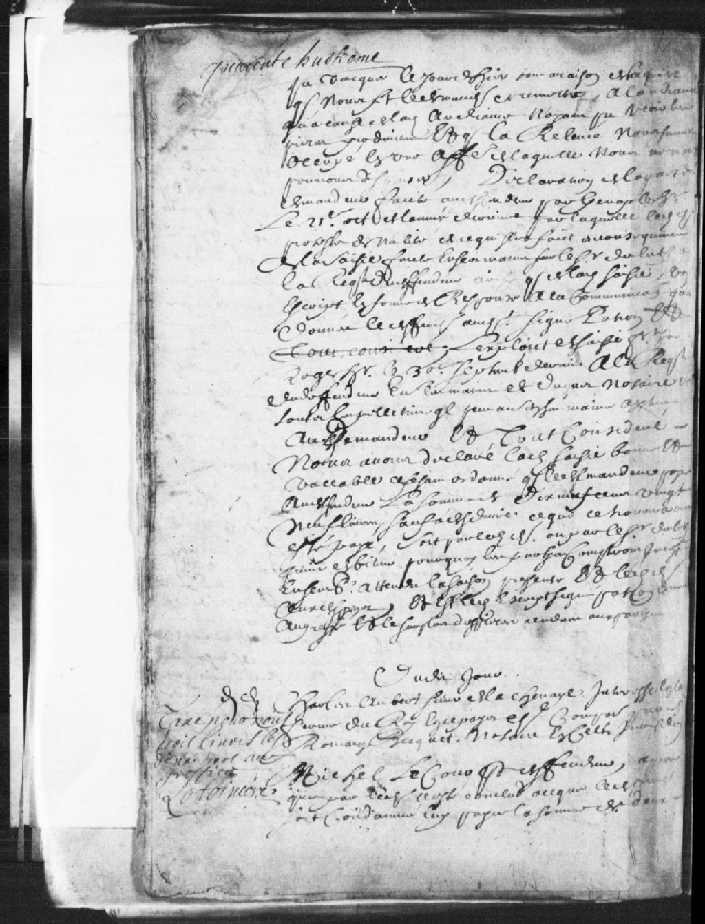 Cause entre Charles Aubert, sieur de LaChenaye (La Chesnaye), intéressé en la Ferme du Roi en Nouvelle-France, demandeur, comparant par maître Romain Becquet, notaire de la Juridiction de Québec, et Michel Lecours, défendeur, à propos de la vente et de la livraison de marchandises ; le défendeur est condamné à payer au demandeur la somme de 2894 livres, 6 sols et 3 deniers, avec dépens