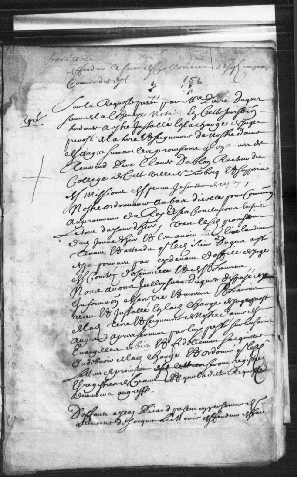 Requête présentée par maître Pierre Duquet, sieur de La Chesnaye, notaire en la Juridiction de Québec, à propos de la charge de juge prévôt de la terre et seigneurie de Notre-Dame-des-Anges ; suivant la provision faite par le Révérend Père Claude Dablon, recteur du Collège de la ville de Québec et supérieur des missions des Pères Jésuites en Nouvelle-France, ledit sieur Duquet a été élu d'office juge du comté d'Orsainville et de Saint-Laurent, et après l'information faite de ses vie et moeurs, ledit sieur est reçu et installé en sa dite charge de juge prévôt, serment par lui prêté sur les Saintes Évangiles ; il est ordonné que les lettres de provision seront enregistrées au greffe
