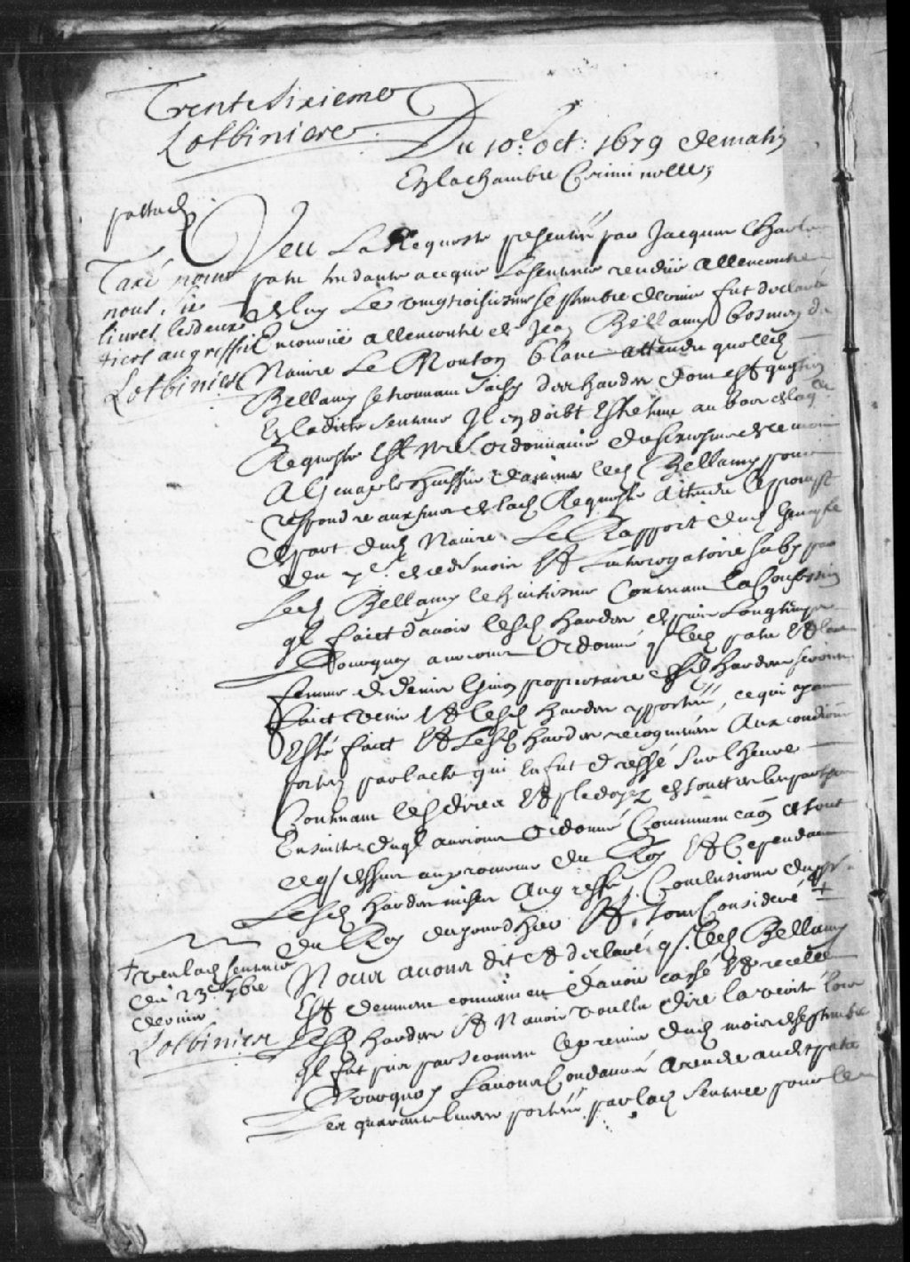 Requête de Jacques-Charles Patu (Patut) afin que la sentence du 23 septembre 1679 soit déclarée encourue à l'encontre de Jean Bellamy, bosseman du navire le «Mouton Blanc» ; il est fait mention de l'interrogatoire dudit Bellamy en date du 8 octobre, lequel contient sa confession à l'effet qu'il a les hardes dont il est question, lesquelles hardes sont reconnues par l'épouse de Denis Guyon (Guion), et ledit Bellamy est reconnu coupable d'avoir caché lesdites hardes, il est condamné à rendre audit Patu les 40 livres mentionnées en la susdite sentence, défense lui est faite de récidiver, et lesdites hardes sont données en aumône aux pauvres de l'Hôtel-Dieu de Québec