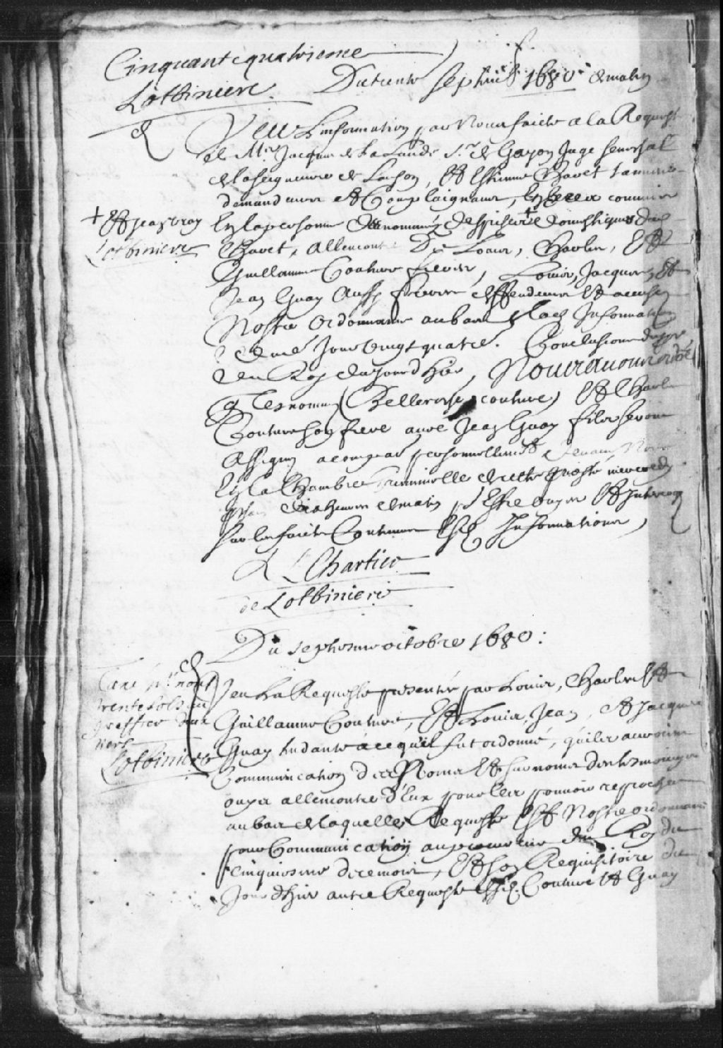 Requête de Louis Couture, Charles Couture, Guillaume Couture, Louis Guay, Jean Guay et Jacques Guay ; il est ordonné que les témoignages entendus à leur encontre leur seront communiqués, et que le procès sera repris dans trois jours, 7 octobre 1680, Archives nationales à Québec, Fonds Prévôté de Québec, (03Q,TL1,S11,SS1,D13,P55).
