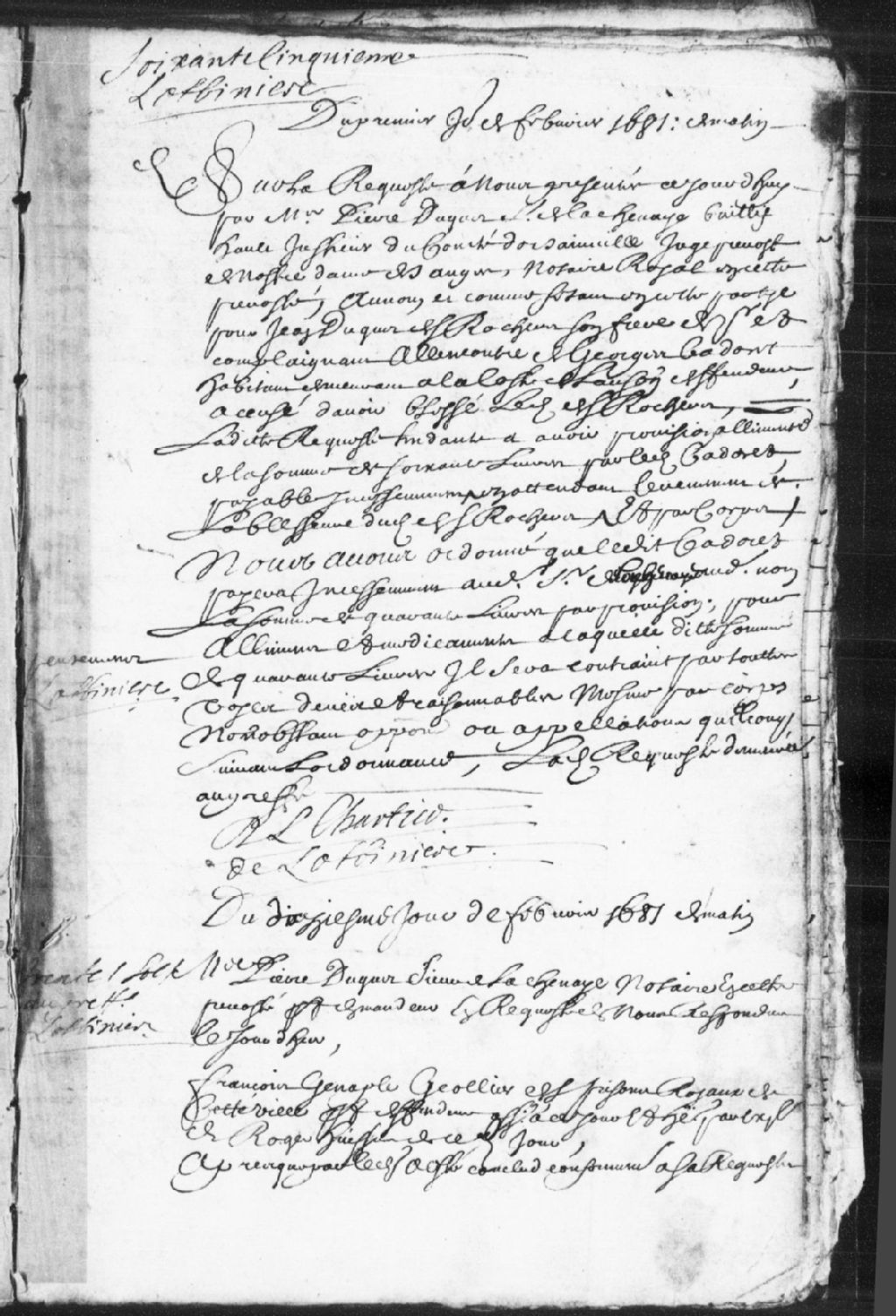 Cause entre maître Pierre Duquet, sieur de La Chesnaye, haut justicier du comté d'Orsainville, juge prévôt de Notre-Dame-des-Anges, notaire royal en la Prévôté de Québec, au nom et comme faisant pour Jean Duquet dit Desroches, son frère, demandeur et complaignant, et Georges Perrotin, habitant demeurant en la côte de Lauzon, défendeur, accusé d'avoir blessé ledit Desroches ; il est fait mention d'une requête pour provision alimentaire, et il est ordonné que ledit Perrotin paiera incessamment la somme de 40 livres pour provision d'aliments et de médicaments