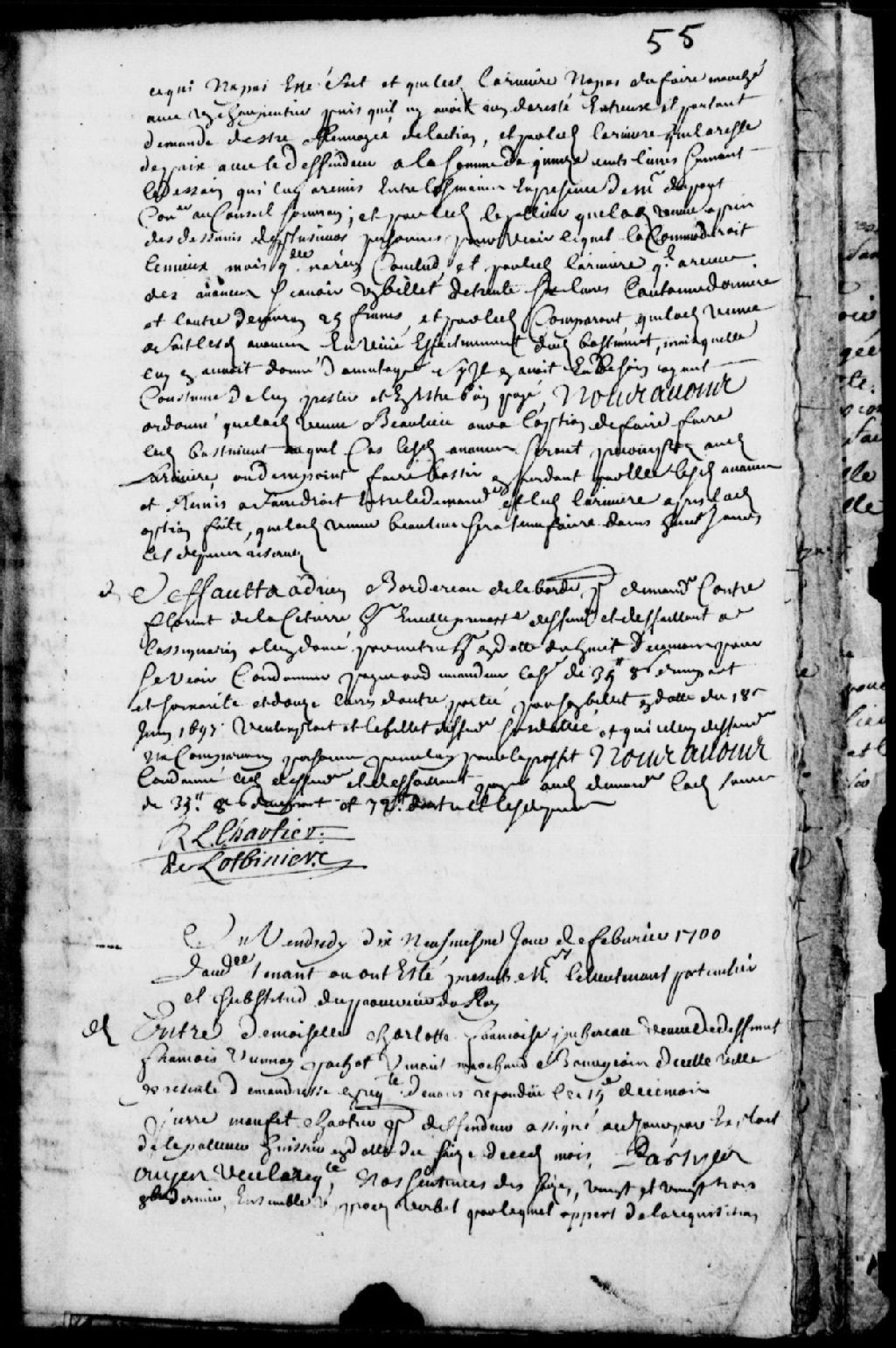 Cause entre demoiselle Charlotte-Françoise Juchereau, veuve du feu François Viennay-Pachot, marchand bourgeois de Québec, demanderesse, et Pierre Maufay, charretier, défendeur, à propos d'un baril égaré appartenant à ladite demanderesse ; il est fait mention de la décharge des bateaux venus de France, et il est ordonné que la même perquisition qui a été faite à Québec sera faite à Montréal, aux Trois-Rivières et en d'autres lieux, 19 février 1700, Archives nationales à Québec, Fonds Prévôté de Québec, (03Q,TL1,S11,SS1,D24,P150).