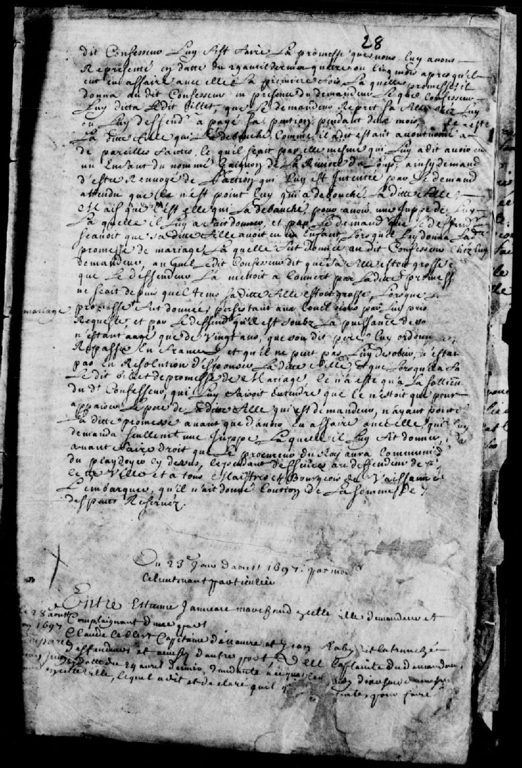 Procès contre Claude Leclerc et Jean Raby dit Latranchée, à propos de vols et de ruptures de portes ; il est fait mention des témoignages (interrogatoires), mention de l'Île-aux-Lièvres, des ordonnances du 24 avril et du 4 juillet, d'un navire naufragé à ladite Île-aux-Lièvres appartenant audit Leclerc, du nommé Jannot (Janot - Janneau), de Jean Boucher et de Marie Saint-Denis, d'un décret de prise au corps (arrestation) contre lesdits Leclerc et Latranchée ; il est aussi fait mention d'excès commis sur la personne dudit Jannot, d'un départ pour la France, de Pierre Dubrac, marchand de Bayonne, de présent à Québec ; il est déclaré que lesdits Leclerc et Latranchée sont coupables, il leur est fait défense de récidiver, et ils sont condamnés à 150 livres d'intérêts envers ledit Jannot, et à 20 livres d'aumône envers les Pauvres de l'Hôpital Général, avec dépens