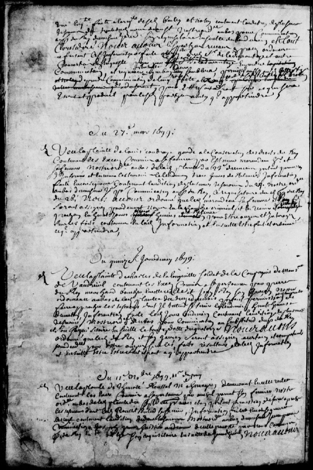Cause entre Louis Coudray (Coudret), garde de la conservation des droits du Roi, demandeur, et Étienne Marandeau (Maranda) et son épouse, défendeurs, à propos d'excès commis sur l'épouse dudit Coudray par lesdits défendeurs, lesquels seront assignés afin d'être interrogés