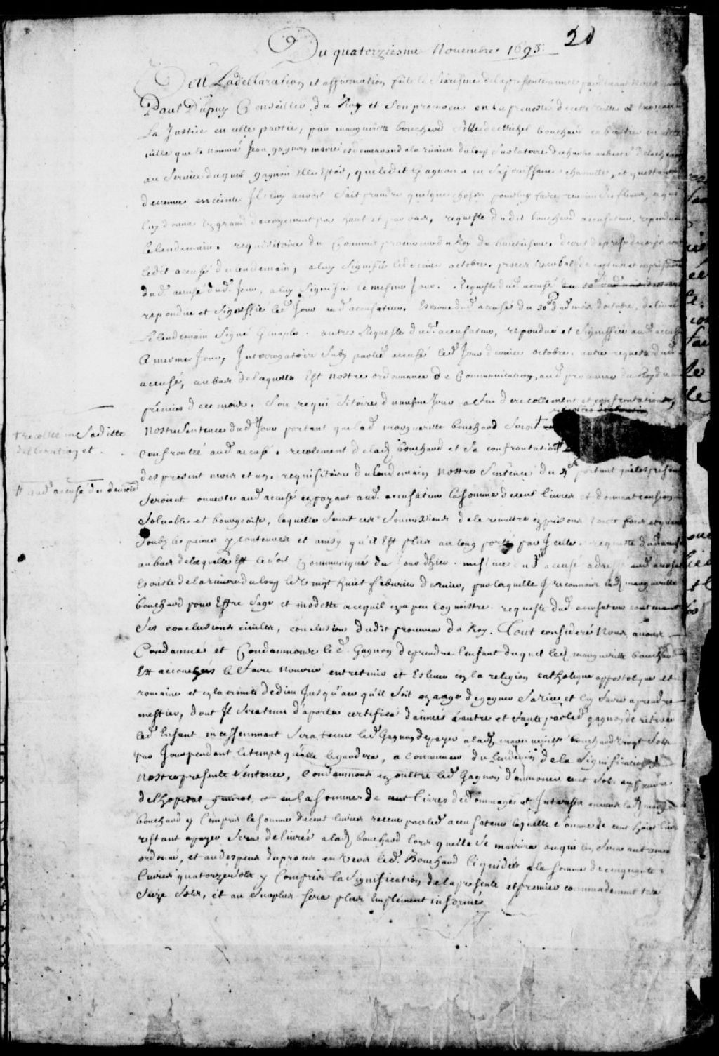 Cause entre Michel Bouchard, cabaretier de Québec, demandeur, et Jean Gagnon, défendeur, lequel est accusé d'avoir abusé de Marguerite Bouchard (viol), fille dudit demandeur, de l'avoir mise enceinte et de lui avoir fait prendre quelque chose pour lui faire perdre l'enfant ; ledit Gagnon est condamné à prendre l'enfant à sa naissance pour l'entretenir et le faire élever en la religion catholique, apostolique et romaine, et ce, jusqu'à ce qu'il soit en âge de gagner sa vie, et devra en outre lui apprendre un métier, et est en outre condamné à payer 100 sols à l'Hôpital Général, et 100 livres de dommages audit demandeur, laquelle somme devra être remise à ladite Bouchard pour qu'elle se marie