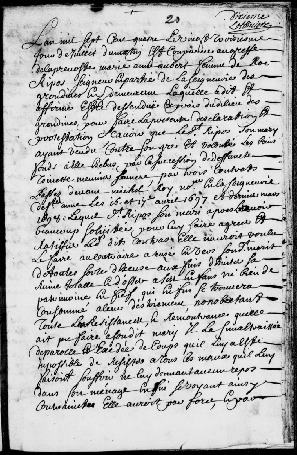 Comparution de Marie-Anne Aubert, épouse de Roch Ripault, seigneur en partie de la seigneurie des Grondines, y demeurant, laquelle a déclaré être venue desdites Grondines pour affirmer que son dit époux a vendu, contre son gré, les biens à elle échus provenant de la succession de la défunte Antoinette Meunier, sa mère, ledit époux ayant obtenu lesdits biens par force, coups, mauvais traitements et excès de parole, mention de trois contrats passés devant Michel Roy, notaire en la seigneurie de Sainte-Anne, en date du 16 avril, du 17 avril et du 30 mars 1698, et mention d'un contrat passé devant Daniel Normandin, notaire de Batiscan, en date du 18 avril 1704