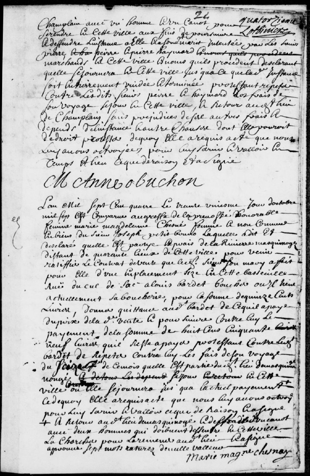 Comparution de l'honorable femme Marie-Madeleine Chenay, épouse non commune en biens du sieur Joseph Petit dit Bruneau (Bruno), laquelle a déclaré être partie de la rivière Maskinongé pour ratifier le contrat de vente, que son mari a fait pour elle, d'un emplacement sis en la Basse-Ville de Québec, rue du Cul-de-Sac, vendu à Louis Bardet, boucher, pour la somme de 1500 livres