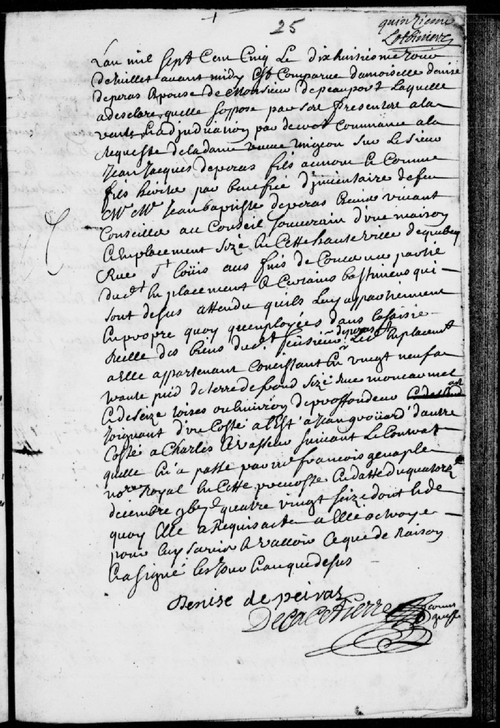 Comparution de la demoiselle Denise de Peiras, épouse de monsieur de Beauport [Joseph Giffard], laquelle s'oppose à la vente et adjudication d'une maison, d'un emplacement et de bâtiments sis en la Haute-Ville de Québec, rue Saint-Louis, mention d'un décret, fait à la requête de la dame veuve Migeon, concernant le sieur Jean-Jacques de Peiras fils, au nom et comme fils héritier, mention de l'inventaire du défunt Jean-Baptiste de Peiras, de son vivant conseiller au Conseil souverain, et mention de la rue Mont-Carmel et d'un contrat passé devant François Genaple, notaire royal en la Prévôté de Québec, le 14 décembre 1696