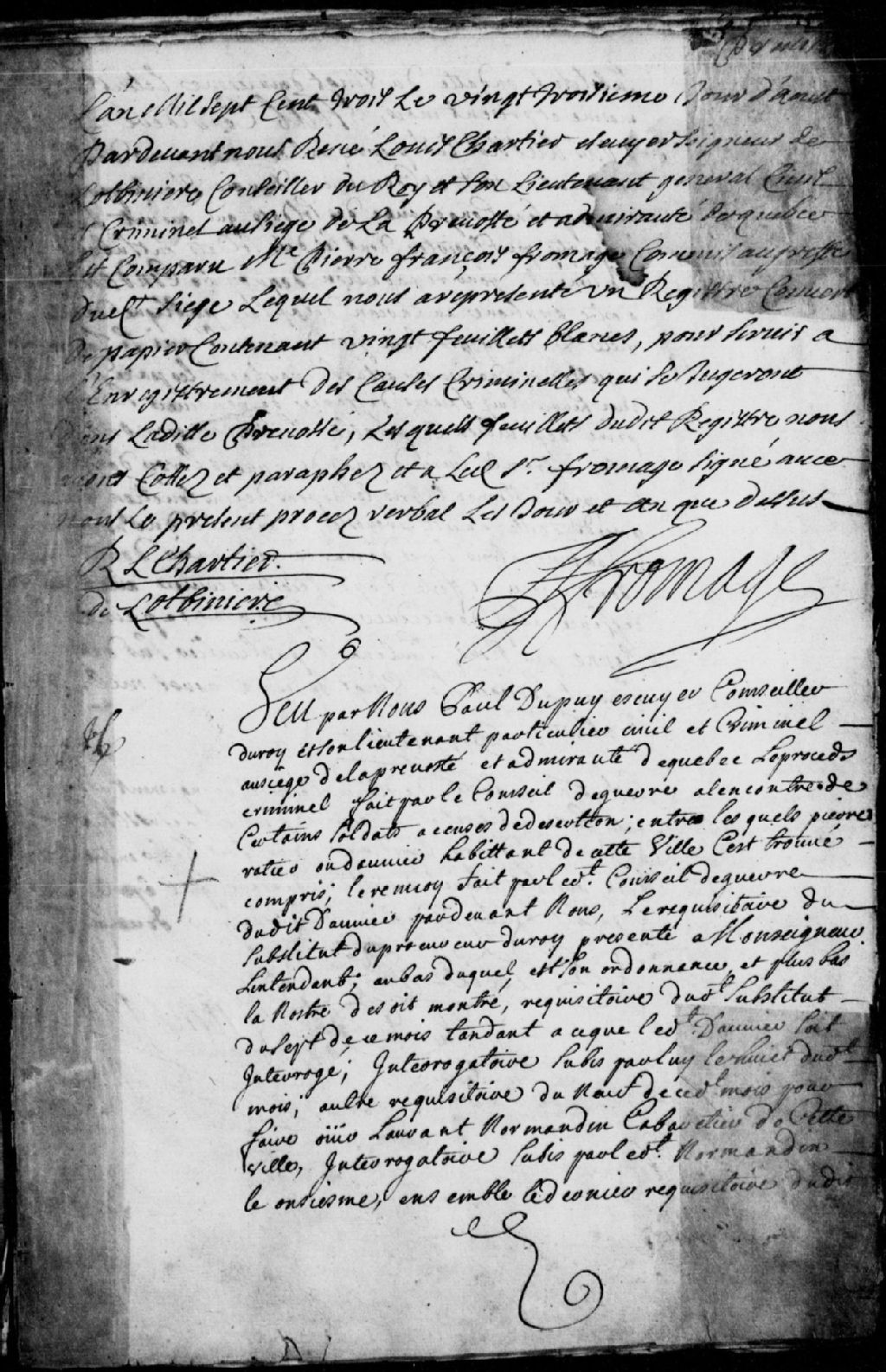 Procès à l'encontre de certains soldats accusés de désertion, mention de Pierre Ratier, habitant de Québec, qui s'est trouvé impliqué, mention du renvoi dudit Ratier devant la Prévôté de Québec par le Conseil de guerre, requête pour procéder à l'interrogatoire dudit Ratier, assignation de Laurent Normandin, cabaretier de Québec, lequel est interrogé, ledit Ratier est trouvé coupable d'avoir voulu partir du pays sans congé avec d'autres soldats, il est condamné au carcan sur la place publique de la ville de Québec, et à y demeurer attaché pendant deux heures, avec défense faite à lui de récidiver, et en plus à 30 livres d'amende envers le Roi, et ledit Normandin est condamné à 3 livres d'amende pour avoir donné à boire le jour de la Pentecôte, et défense faite à lui de récidiver