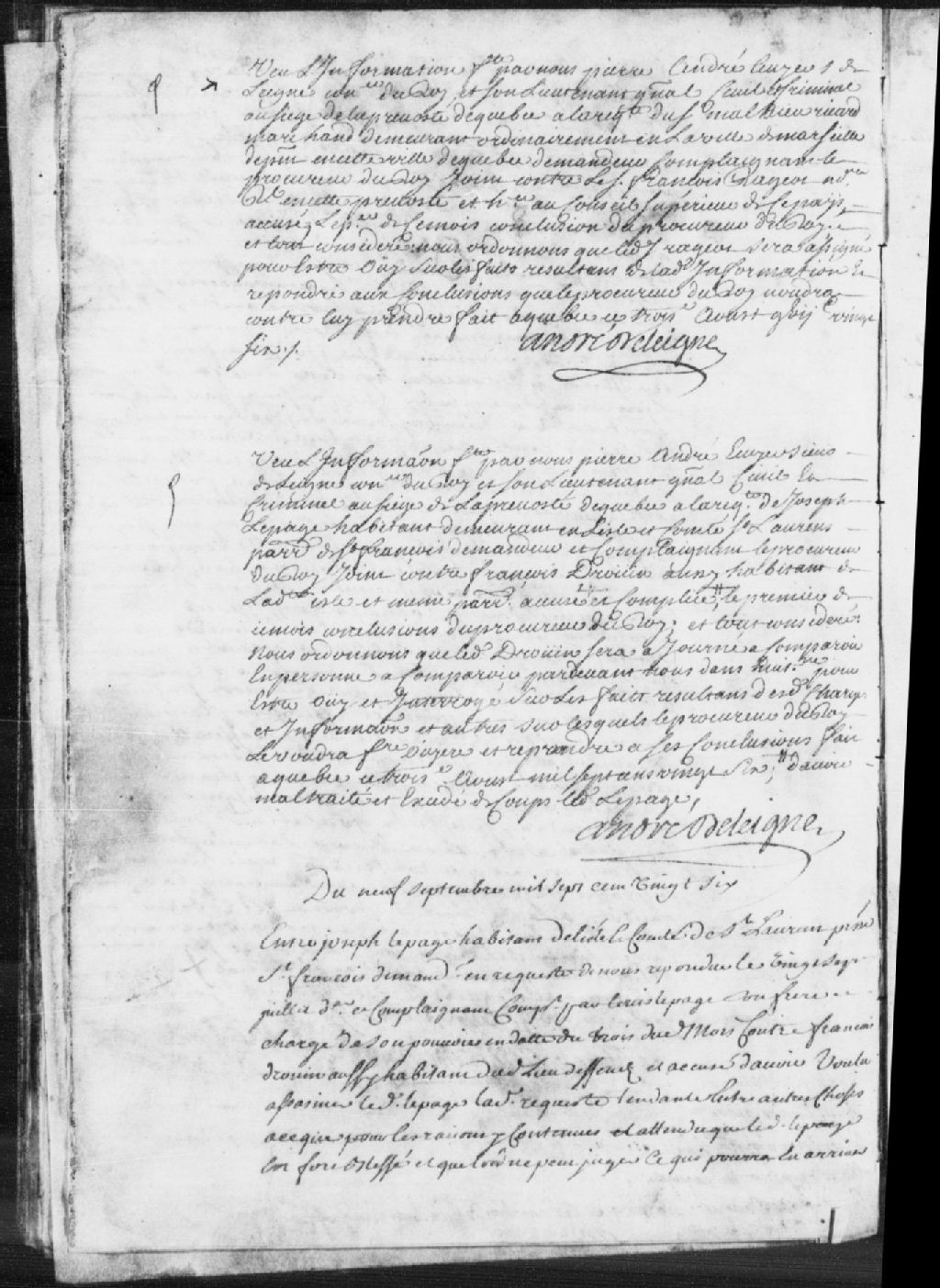 Cause entre Joseph Lepage, habitant demeurant en l'île et comté Saint-Laurent (île d'Orléans), en la paroisse de Saint-François, demandeur et complaignant, et François Drouin, habitant demeurant en l'île et comté Saint-Laurent, en la paroisse de Saint-François, défendeur, accusé d'avoir excédé de coups ledit Lepage et complice ; il est ordonné que ledit Drouin sera assigné à comparaître en personne pour être interrogé