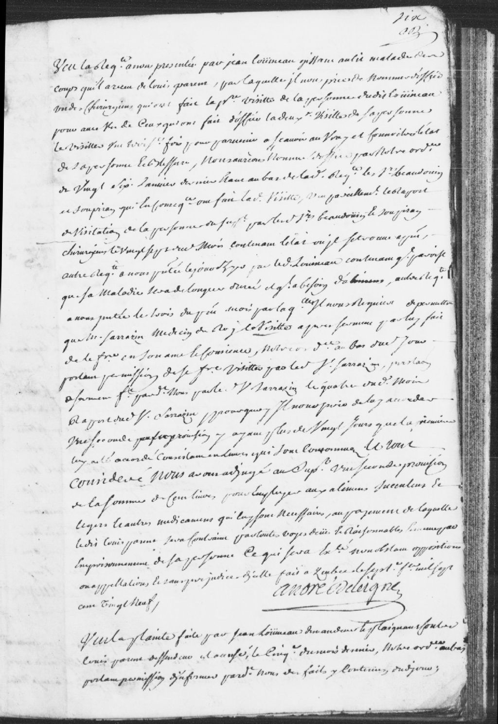 Cause entre Jean Louineau (Luneau), demandeur et complaignant, gisant au lit, malade des coups qu'il a reçus, et Louis Parent, accusé et complice ; mention des sieurs Beaudoin (Beaudouin) et Soupiran, chirurgiens nommés d'office pour faire la visite et le procès-verbal de visite dudit malade, il en est conclu que la maladie durera longtemps et que le malade aura besoin d'aliments, il est convenu de lui accordé une seconde provision car la première fut accordée il y a plus de 20 jours, ledit accusé est condamné à 100 livres pour les aliments et médicaments, 7 février 1729, Archives nationales à Québec, Fonds Prévôté de Québec, (03Q,TL1,S11,SS1,D66,P11).