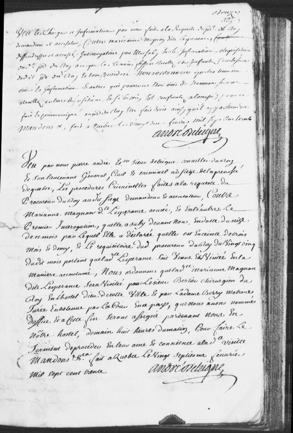 Procès de Marie-Anne Magnan dit l'Espérance (Lespérance), défenderesse et accusée ; interrogatoire de l'accusée dans lequel elle déclare être enceinte de trois mois et demi, et ordonnance à l'effet que ladite Magnan sera visitée par le sieur Berthier, chirurgien du Roi en l'Hôtel-Dieu de Québec et par la dame Berry, matrone jurée (sage-femme que les juges nomment dans certains procès pour visiter les femmes), entretenue par la cour en Nouvelle-France, nommée d'office