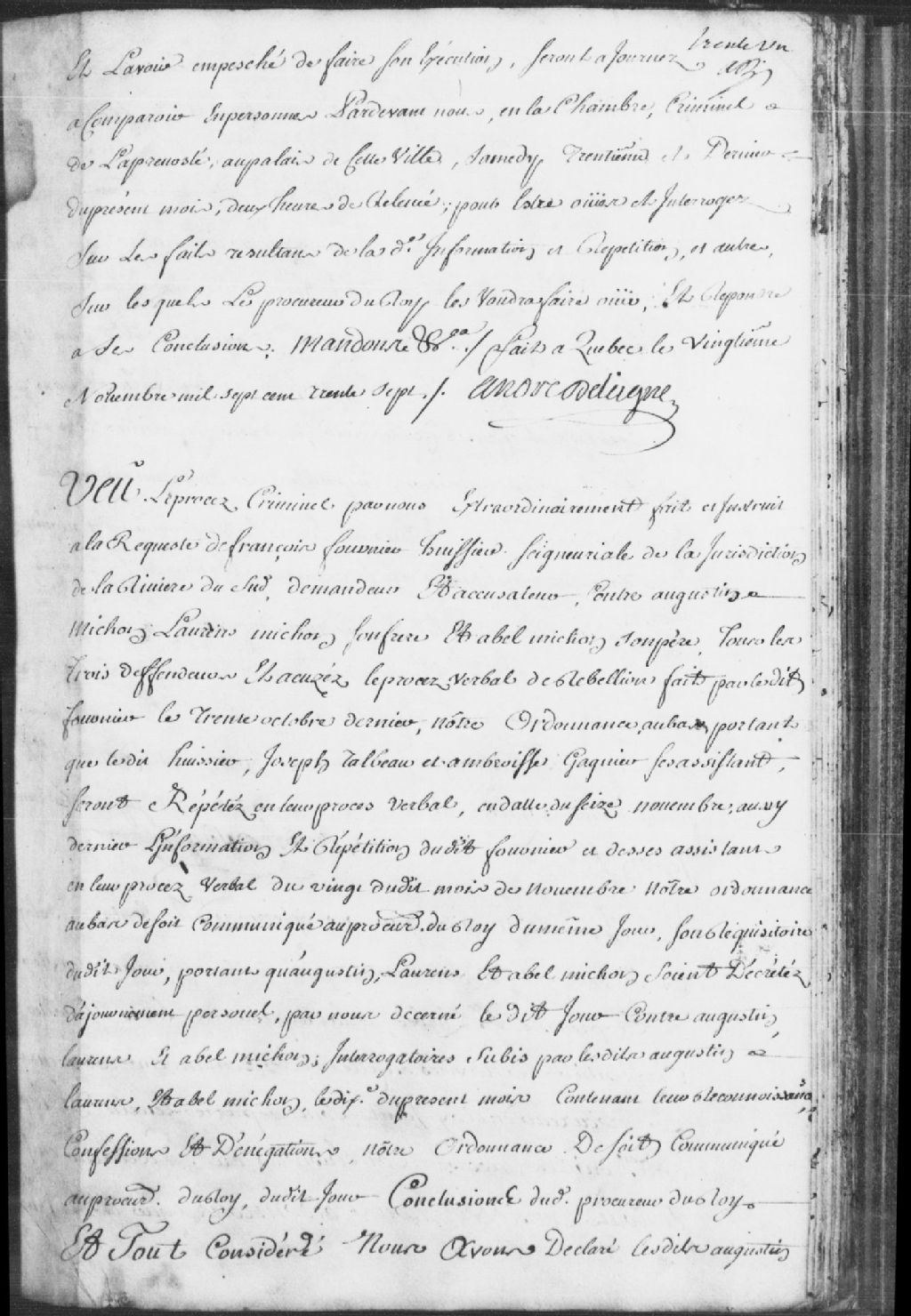 Cause entre Joseph Fournier, huissier en la Juridiction seigneuriale de la Rivière-du-Sud, demandeur et accusateur, et Abel Michon, notaire et huissier royal, accusé, et Augustin et Laurent Michon, ses enfants et complices, à propos d'un procès verbal de rébellion ; mention des huissiers Joseph Talbot et Ambroise Gagnier (Gagné), assistants dudit Fournier, décret d'ajournement personnel contre lesdits accusés et interrogatoires ; lesdits Michon sont déclarés coupable de rébellion pour avoir battu ledit Fournier à coups de poing et de bâton, de l'avoir empêché de faire son exécution et de l'avoir même menacé de le tuer, lesdits Michon seront mandés pour être admonesté (réprimandé sévèrement), avec défense de récidiver, ils sont condamnés à payer 100 livres de dommages et intérêts envers ledit Fournier et une somme de 15 livres d'aumône applicable à la Fabrique de l'église Saint-Thomas, avec dépens, ledit jugement sera lu publiquement et affiché à la porte de l'église, afin que personne n'ignore