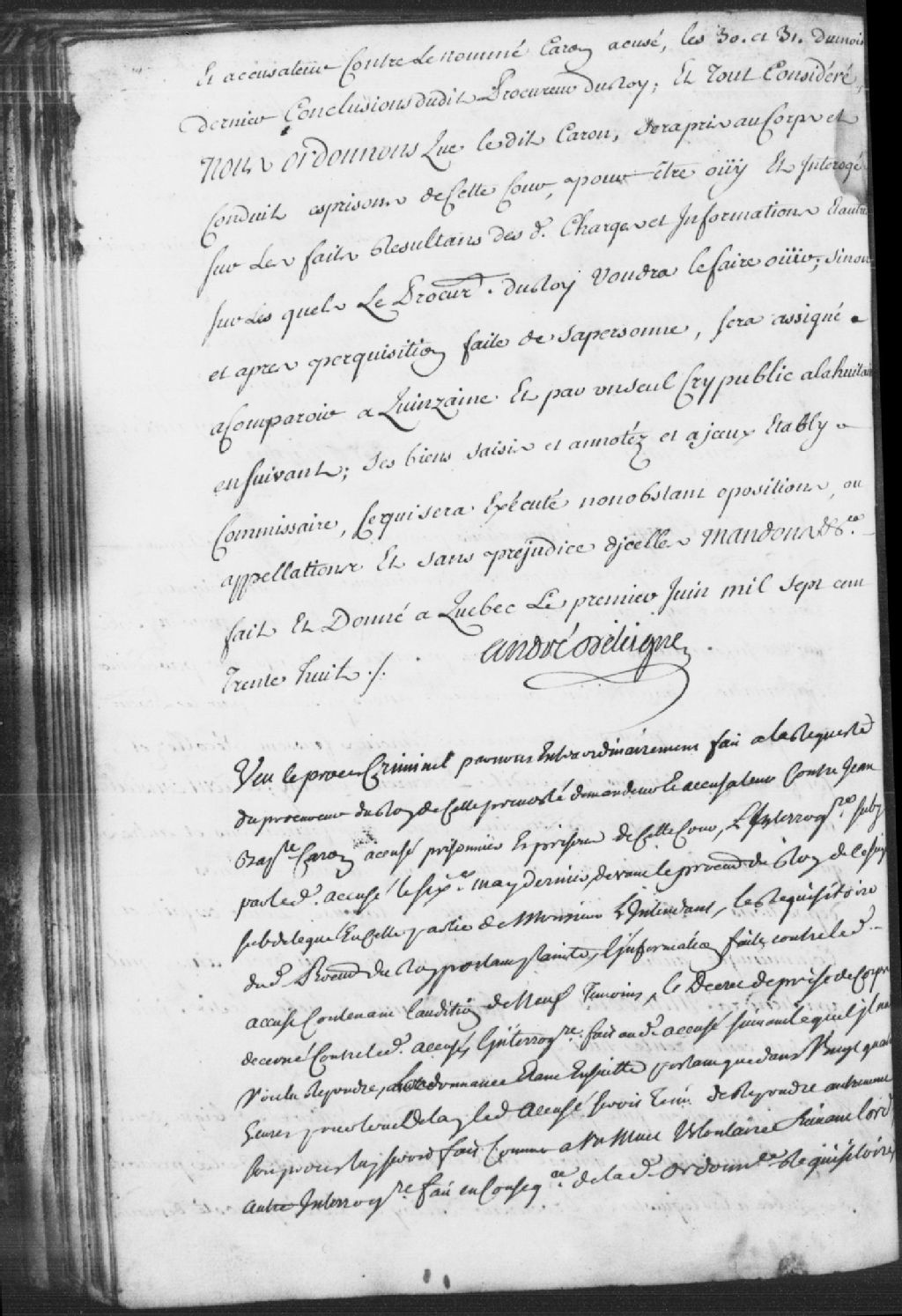 Procès de Jean-Baptiste Caron, accusé et prisonnier ; informations, mention des dépositions de neuf témoins, informations par addition, récolements et confrontations, l'interrogatoire de l'accusé sur la sellette, et ordonnance à l'effet qu'il sera plus amplement informé pendant trois mois contre ledit accusé, il gardera la prison pendant ce temps, 14 juin 1738, Archives nationales à Québec, Fonds Prévôté de Québec, (03Q,TL1,S11,SS1,D66,P77).