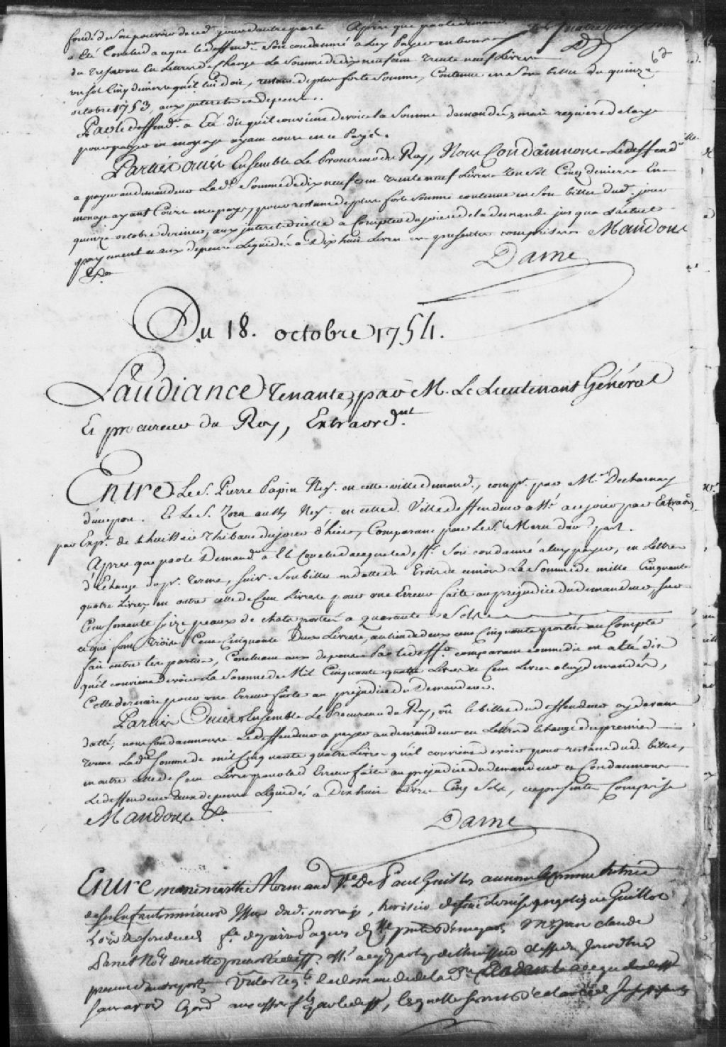 Cause entre Marie-Marthe Normand, veuve du feu Paul Guillot, au nom et comme tutrice de leurs enfants mineurs, faisant aussi pour les héritiers de feue Louise-Angélique Guillot, épouse de Pierre Paquet, demanderesse, et maître Jean-Claude Panet, notaire en la Prévôté de Québec, défendeur, à propos du paiement d'une certaine somme ; le défendeur est condamné à payer au demandeur la somme de 536 livres, 18 octobre 1754, Archives nationales à Québec, Fonds Prévôté de Québec, (03Q,TL1,S11,SS1,D84,P106).