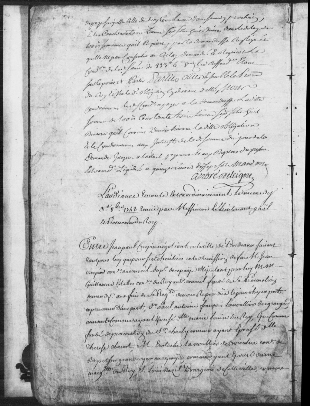 Cause entre Jean-Paul Crespin, négociant de Bordeaux, faisant tant pour lui que pour ses cohéritiers en la succession de feu maître Jean Crespin, de son vivant conseiller au Conseil supérieur en Nouvelle-France, comparant par maître Guillaume Estèbe, conseiller du Roi au Conseil, fondé de sa procuration, demandeur, et le sieur Paul-Antoine-François Lanouiller Desgranges (Desgrandes), comme ayant épousé la demoiselle Marie-Louise Duroy, et comme fondé de procuration du sieur Charly, comme ayant épousé la demoiselle Thérèse Charest, maître Eustache Lanouiller de Boisclerc, conseiller du Roi et son grand voyer en Nouvelle-France, comme ayant épousé Marguerite Duroy, le sieur Louis Baril, bourgeois de Québec, comme ayant épousé demoiselle Charlotte Duroy, le sieur Pierre Poirier, au nom et comme procureur du sieur Gabriel Côté, tuteur des mineurs Gosselin, tous héritiers en la succession de la défunte dame Marguerite Levasseur, veuve de Pierre Duroy, tous défendeurs, ledit Boisclerc présent en personne et les autres comparant par l'huissier Courtin, chargé de leur pouvoir, à propos du paiement d'une certaine somme; mention de Prisque Lessard, mention des locataires et fermiers des immeubles de la succession de ladite défunte Duroy, les défendeurs auxdits noms sont condamnés à payer au demandeur, audits noms, la somme de 650 livres, 11 sols et 6 deniers, avec dépens liquidés à 18 livres, il est ordonné que ledit Lessard videra ses mains en celles du demandeur de la somme de 500 livres qu'il a reconnu devoir à la femme de l'Auvergne (Lauvergne), il est ordonné qu'un nommé Damphous (Damphouse) videra ses mains en celles du demandeur de la somme de 37 livres et 10 sols pour 6 mois de loyer