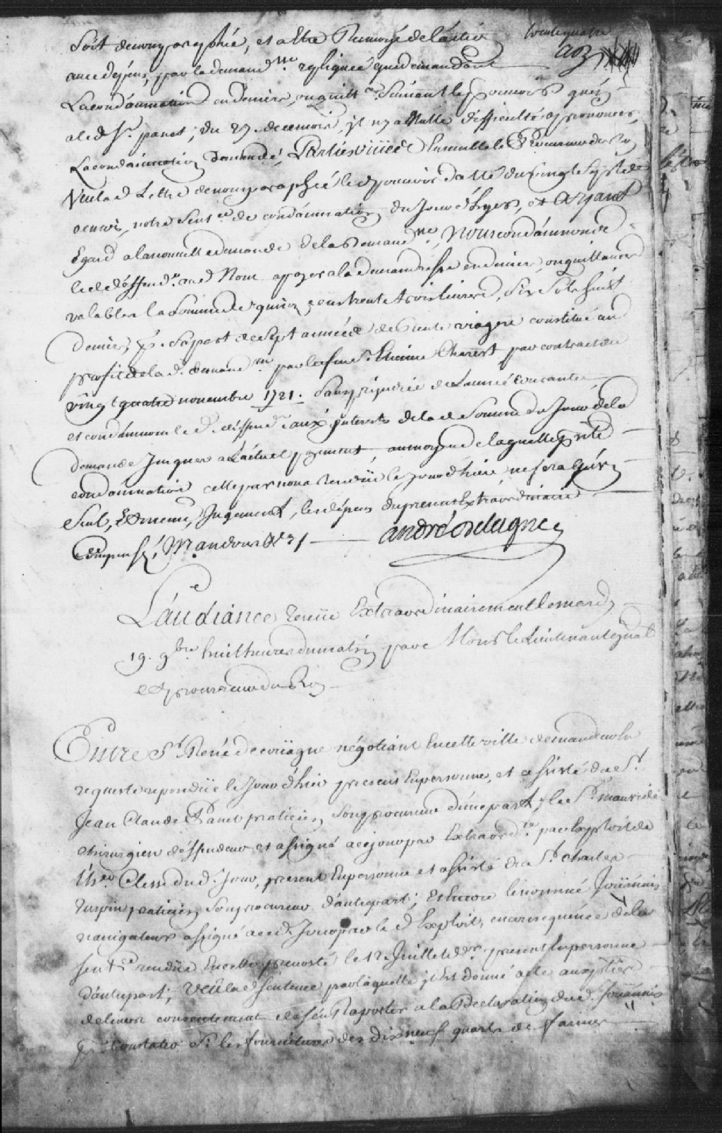 Cause entre René DeCouagne, négociant de Québec, demandeur, assisté du sieur Jean-Claude Panet, praticien, son procureur, et le sieur Mauvide, chirurgien, défendeur, assisté du sieur Charles Turpin, son procureur, et encore le nommé Joannis, navigateur ; mention de la sentence du 12 juillet 1743, mention de fournitures de farine, de moutons et de beurre, serment prêté par ledit Joannis, le défendeur est condamné à payer au demandeur la somme de 168 livres et 10 sols, le défendeur est aussi condamné aux dépens liquidés à 24 livres, 6 sols et 8 deniers